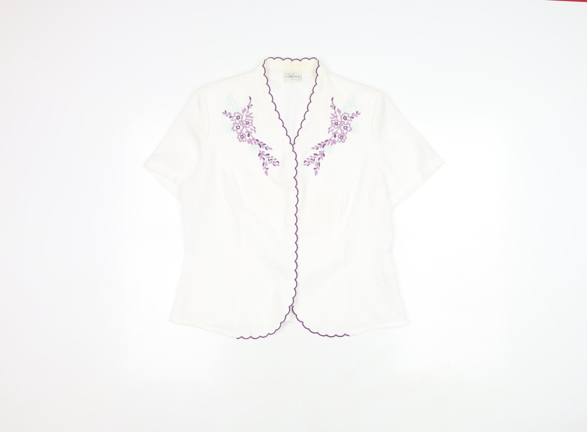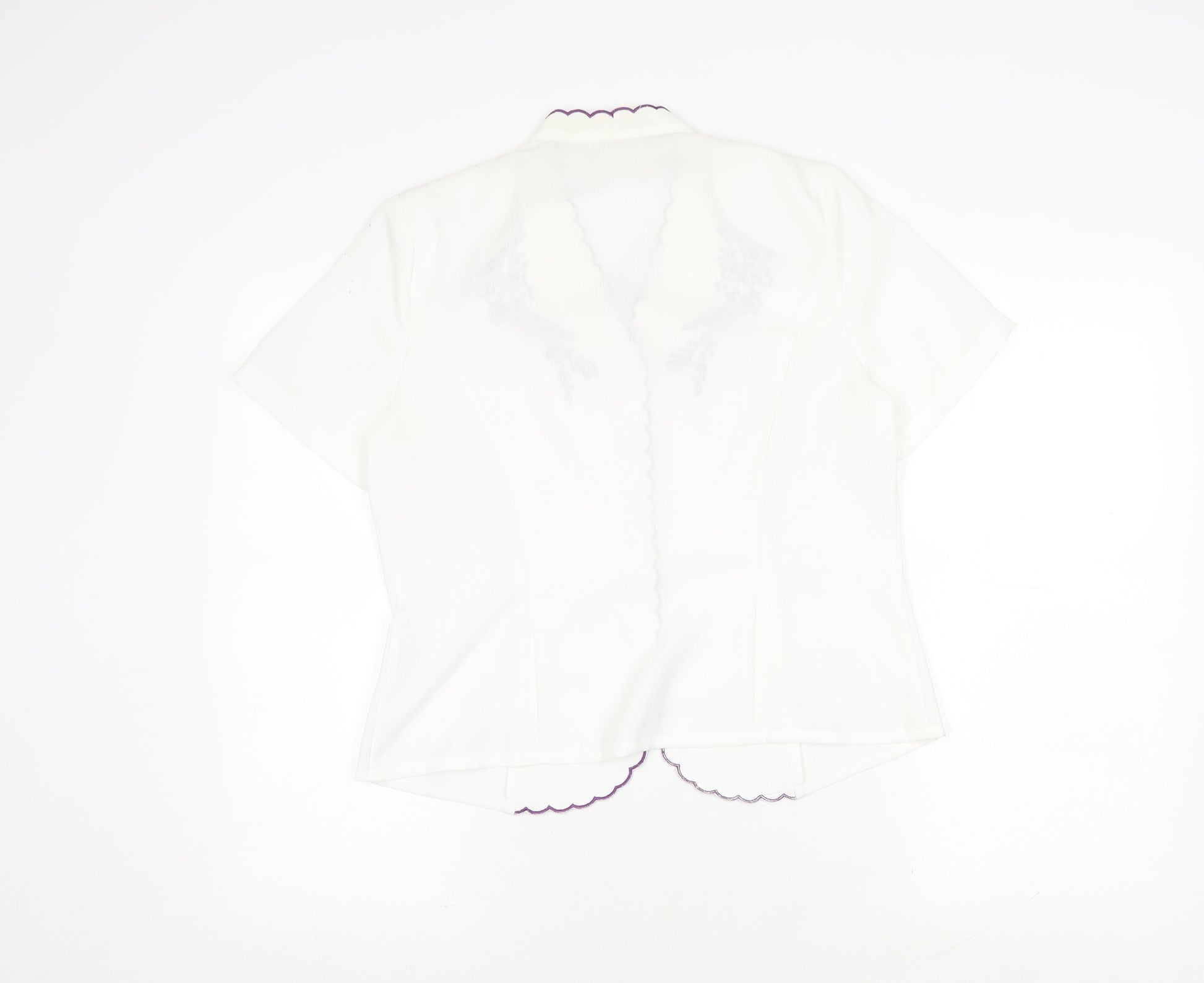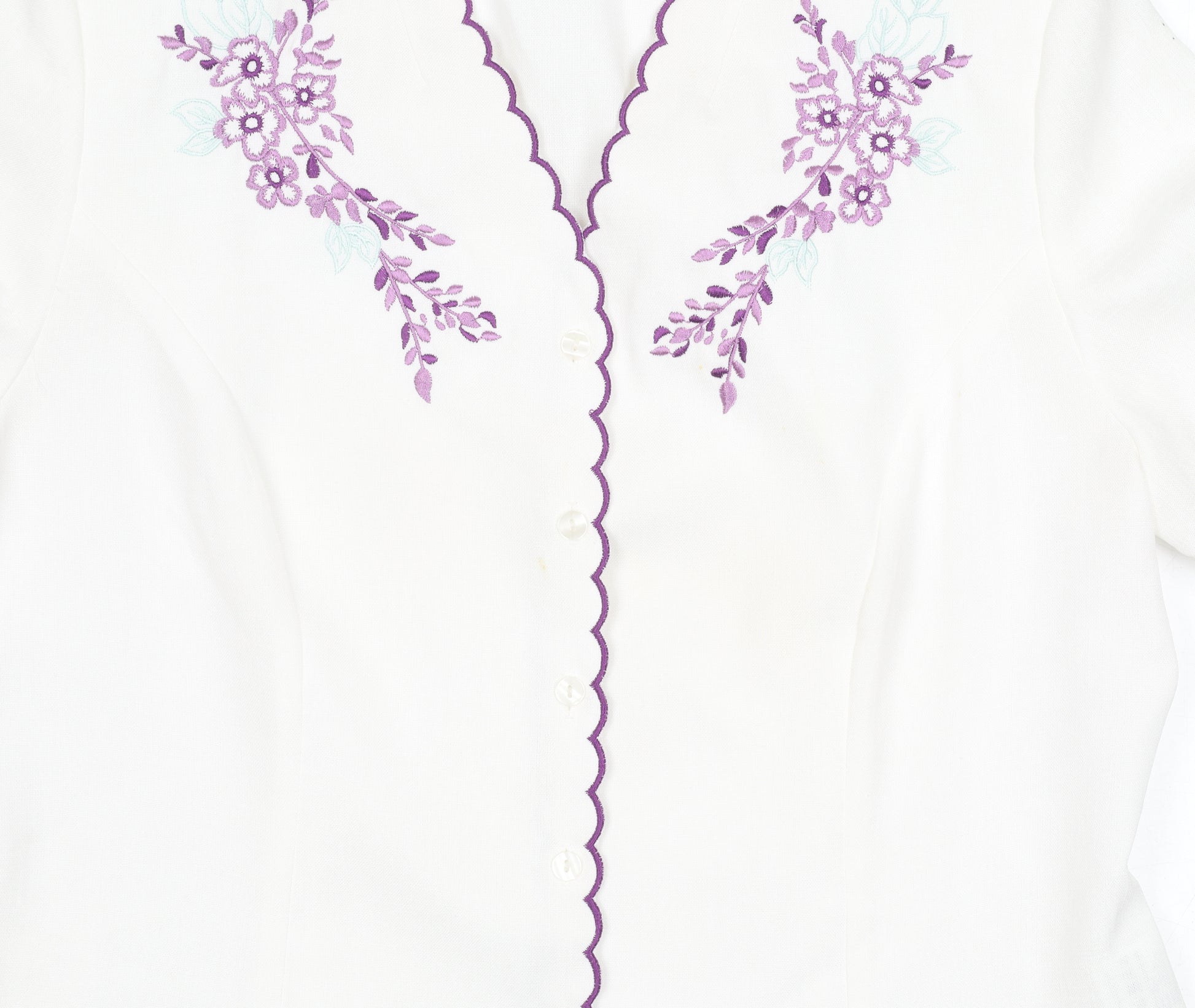 Elevate your wardrobe with this elegantly embroidered blouse from Eastex. Perfectly crafted for women, this classic design is adorned with exquisite floral embroidery in a soft purple hue, making it ideal for those who appreciate subtle elegance. The blouse features a flattering V-neckline, short sleeves for warm days, and a button closure for easy wear. Made from 100% polyester, it promises both comfort and durability. Suitable for casual occasions, this blouse is an excellent choice for spring and summer outings. The classic fit ensures a relaxed yet stylish appearance, while the machine washable feature adds practical convenience. In excellent condition with no visible defects, this charming blouse is a must-have addition, sure to become a staple piece in your seasonal collection.
