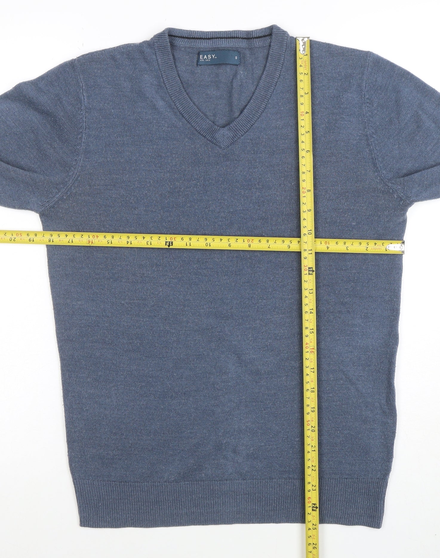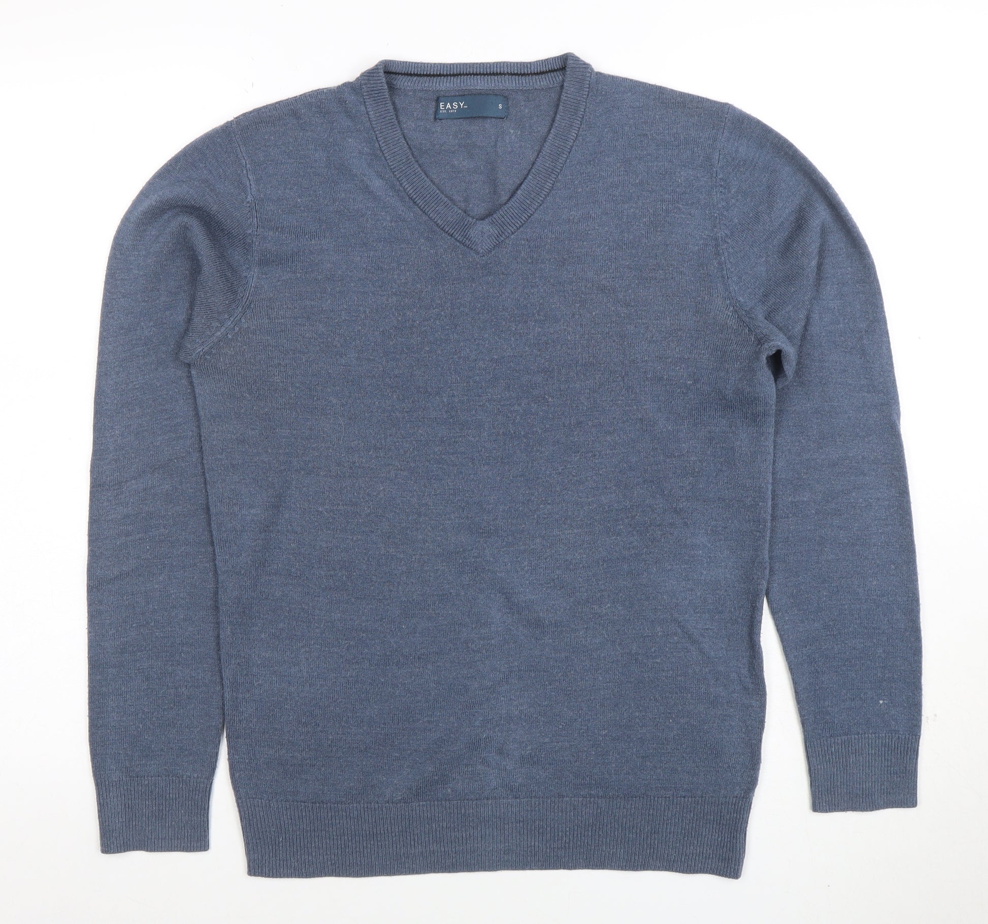 Refresh your wardrobe with this classic men’s V-neck jumper from Easy. Designed in a timeless blue shade, this regular-fit pullover is a versatile piece that transitions effortlessly across seasons. The simple yet refined style features a V-neckline and fine lightweight knit construction, ideal for layering over shirts or wearing on its own for a laid-back look. Crafted from 100% acrylic, this jumper provides a soft, comfortable feel while being easy to care for and maintain its shape wash after wash. The long sleeves and ribbed cuffs offer a clean, structured finish, while the tightly knit texture gives a smooth and flattering silhouette. Perfect for cooler spring days, crisp autumn afternoons, and mild winter wear, this easy-going jumper keeps you warm without adding bulk. Its durable acrylic fabric ensures lasting softness and resilience, making it a reliable everyday essential. This piece pairs effortlessly with jeans, chinos, or smart trousers, suitable for both casual and workwear occasions. Whether layered under a blazer for a smart-casual meeting or worn with denim for a weekend outing, its understated elegance makes it a versatile addition to any menswear collection. The minimalist design ensures timeless appeal, suited to those who appreciate clean and practical styling. In excellent pre-owned condition with only minimal signs of gentle wear, this jumper has been carefully checked to ensure quality. Comfortable, classic, and easy to maintain, it’s the ideal go-to piece when you want simplicity with refined appeal. Add this blue Easy men’s V-neck pullover to your wardrobe for a dependable style that works throughout the seasons.