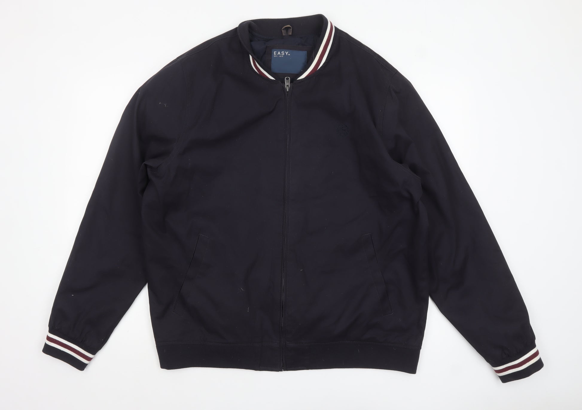 Step up your layering game with this EASY men's bomber jacket in a stylish navy blue tone, perfect for transitional weather. Crafted from a durable and easy-care cotton-polyester blend, it offers both comfort and practicality with its breathable yet structured fabric. The ribbed collar, cuffs, and hem provide that classic bomber silhouette, while the striped details add a subtle retro-sporty touch. Designed in a regular fit for everyday wear, this jacket is lined for extra comfort and warmth, making it ideal for cool spring or autumn days. A full zip closure ensures ease of use, while the side pockets provide convenience and a laid-back look. The minimalist design is enhanced by the faintly embossed brand logo on the chest, showcasing understated style. Machine washable and easy to care for, this jacket is a versatile addition to any modern man's wardrobe — equally suited for casual outings, weekend errands, or relaxed social settings. Pair it effortlessly with jeans, chinos, or joggers for a clean, urban finish. The jacket is in very good pre-loved condition, showing only light lint and minimal signs of wear, reflecting quality craftsmanship and longevity. Whether worn over a T-shirt for a classic off-duty vibe or layered with a shirt for a smarter casual edge, this jacket delivers timeless appeal and reliable everyday comfort. Perfect for men seeking a balance of simplicity, functionality, and style. With its casual yet refined aesthetic, this EASY bomber jacket is an excellent value choice for a versatile outerwear piece that will see frequent rotation through the seasons.