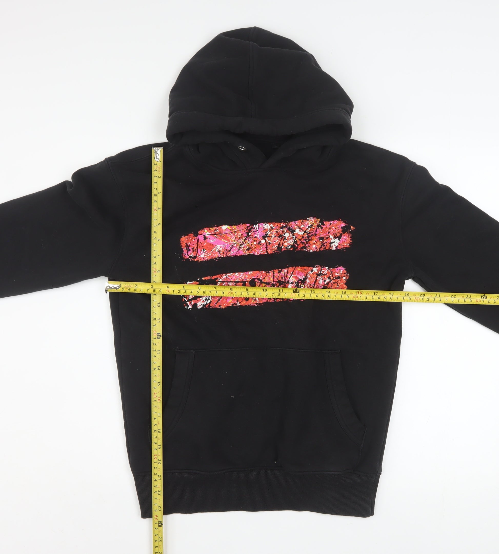 Celebrate your love for Ed Sheeran with this stylish black pullover hoodie, an official commemorative piece featuring his multiply, divide and equals symbols graphic across the chest and tour dates printed on the back. Crafted from a blend of 80% organic cotton and 20% recycled polyester, this hoodie offers a soft, cosy feel that is perfect for all seasons. The classic relaxed fit and brushed fleece interior ensure warmth and comfort, while the kangaroo pocket provides practicality and casual style. Designed in timeless black with a bold red and pink striking print accent, this hoodie is ideal for layering or as a statement piece on its own. The hood with drawstring closure adds extra protection against cooler weather, completing its practical and fashionable appeal. Perfect for casual wear, travel, gigs, or everyday lounging, this women's size Small hoodie is a must-have for any fan. Pair it with jeans or leggings for a relaxed, effortless look that still makes a statement. Light signs of wear are present, consistent with excellent used condition. Whether you’re heading out to a concert or relaxing at home, this Ed Sheeran hoodie will keep you feeling comfortable, stylish, and connected to your favourite music artist. Don’t miss your chance to own an authentic piece of tour memorabilia that blends comfort, sustainability, and fandom in one perfect garment.