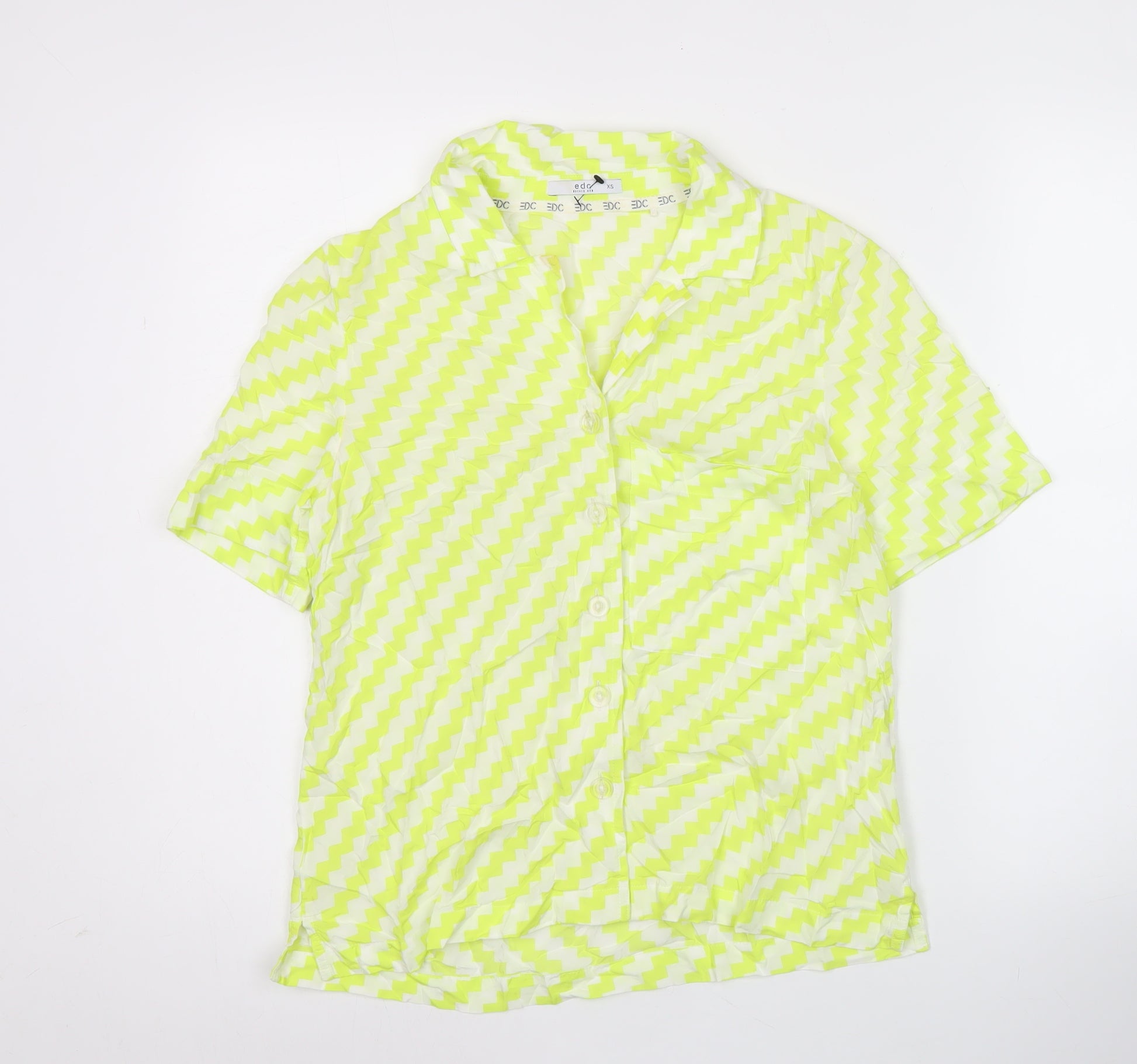 Brighten up your wardrobe with this stylish women's button-up shirt from EDC. Designed in a vibrant yellow zigzag geometric pattern, this shirt delivers a bold and modern twist on a timeless casual essential. Made from 100% viscose, the fabric feels soft, breathable, and lightweight, making it a comfortable choice for everyday wear. The collared neckline and classic short sleeve design provide a polished yet relaxed appearance that is ideal for layering or wearing on its own in warmer seasons.This EDC shirt comes in size XS and offers a flattering regular fit that suits a variety of occasions, whether you're heading out on a casual day, travelling, or meeting friends for a laid-back weekend look. The full button-up closure adds versatility, allowing you to wear it open with a cami underneath or fully closed for a sharper finish. Designed for spring and summer, the lightweight fabric drapes beautifully and helps you stay cool on warmer days while maintaining a stylish, fashion-forward profile.Accented with buttons and featuring a classic collared cut, this shirt combines everyday practicality with standout personality thanks to its bold, colourful design. The woven construction ensures durability and holds the structured shape, while the short fitted sleeves keep the overall look neat and casual. Featuring a cheerful geometric print, this piece is perfect for those who love to express individuality through pattern and colour.With its excellent pre-owned condition and only light signs of wear, this shirt remains in fantastic shape and ready for many more outings. Easy to care for and machine washable, it’s a wardrobe staple that requires little effort to maintain, making it even more appealing.Whether you're elevating jeans, adding flair to shorts, or layering under a blazer, this EDC button-up provides multiple styling possibilities. Its playful energy paired with high-quality material ensures a blend of comfort, practicality, and standout design. A great choice for anyone seeking to refresh their spring or summer style with a shirt that balances casual wearability with striking detail.