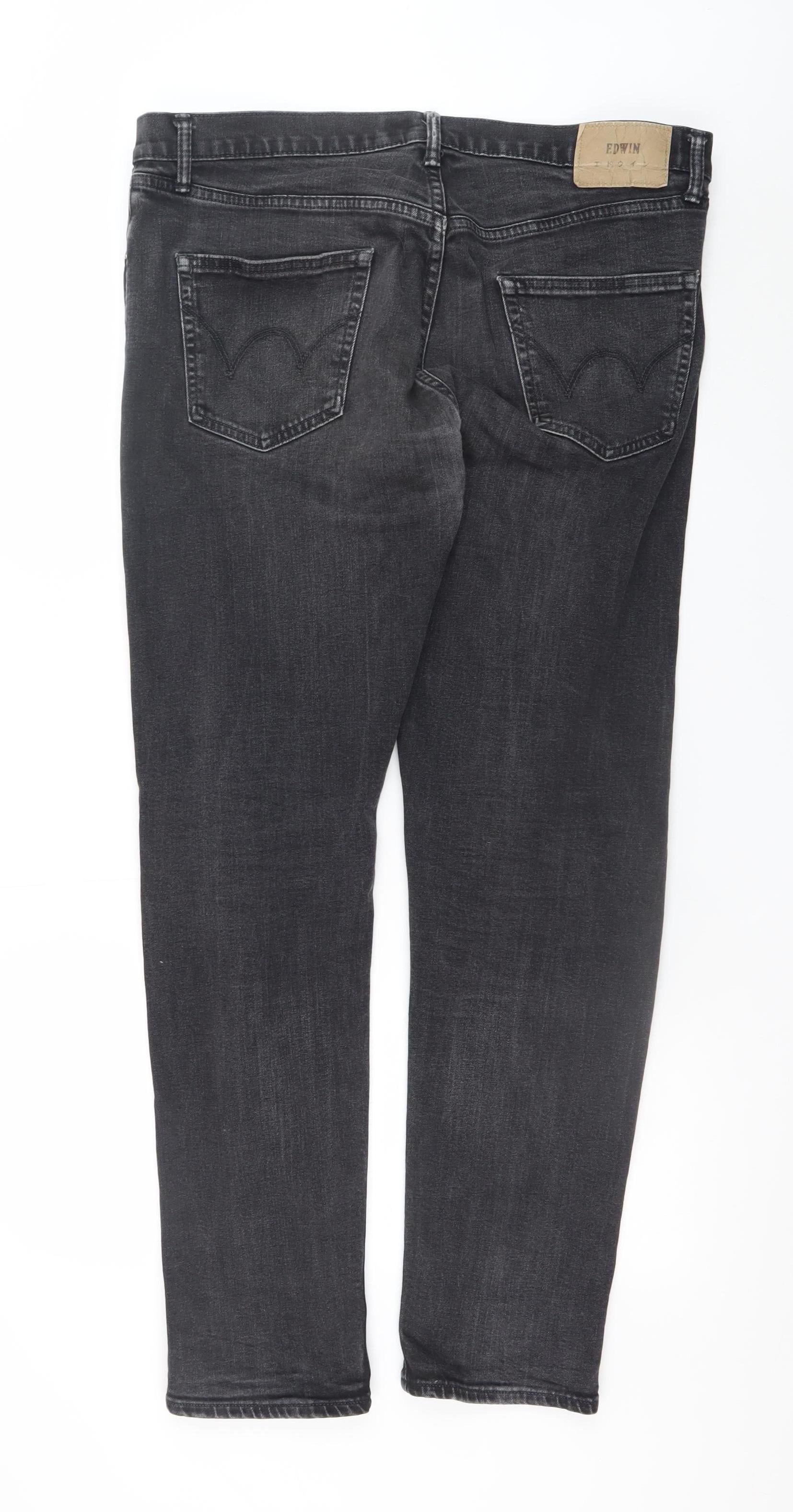 Step up your denim game with these Edwin Men's Black Regular Tapered Jeans, a perfect blend of modern comfort and timeless style. Crafted from high-quality denim with a composition of 98% cotton and 2% polyurethane, these jeans offer just the right amount of stretch for superior comfort and mobility without compromising on durability. The dark wash finish provides a sleek, versatile look that pairs effortlessly with your favourite shirts, jumpers, or jackets for any casual or smart-casual occasion.Designed with a regular fit through the hip and thigh, tapering slightly towards the ankle, these jeans deliver a flattering silhouette that remains comfortable throughout the day. Featuring classic five-pocket styling, including a handy coin pocket, they're both practical and stylish. The zip and button fastening ensures a secure closure, while subtle logo detailing and rivet accents enhance their authentic appeal.These jeans feature a 36-inch waist and 32-inch inside leg, making them an excellent choice for men who value a relaxed yet modern fit. The mid-rise cut adds comfort and ease of wear, suitable for everyday use across multiple seasons—ideal for autumn, spring, and winter looks. Whether worn with trainers and a tee for a relaxed weekend outfit or dressed up with boots and a crisp shirt, these jeans transition seamlessly between styles.In very good pre-loved condition, with only a small mark near the hem that doesn’t detract from their overall appearance, these jeans promise plenty of wear left in them. The softness of the denim combined with its long-lasting quality makes them a wardrobe essential for the practical yet style-conscious man. Discover the effortless sophistication that Edwin is known for with this classic pair—a reliable denim essential that offers comfort, fit, and understated style every time you wear them.