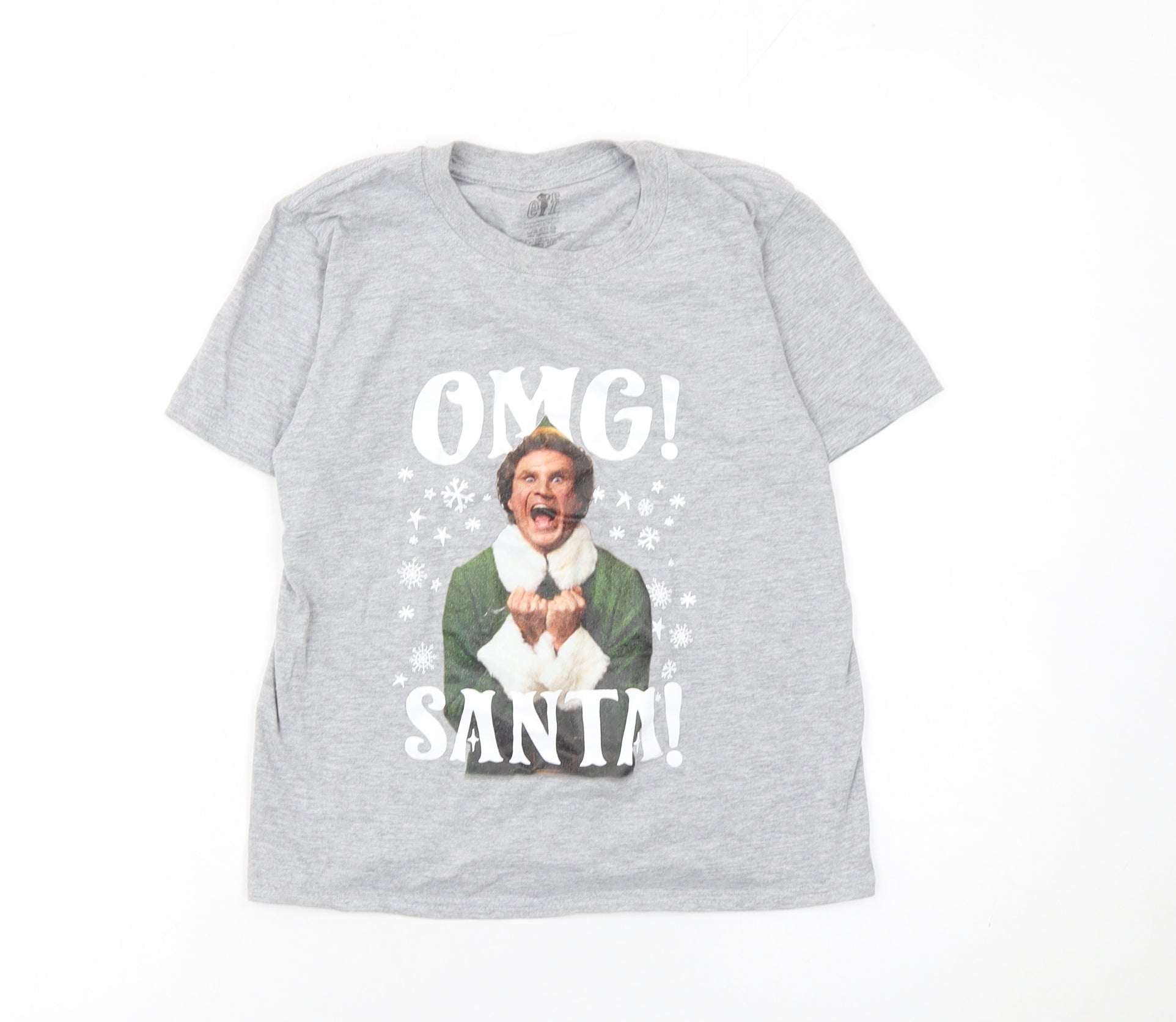 Spread the holiday cheer with this delightful Elf boys grey Christmas T-shirt, inspired by one of the most beloved Christmas films. Perfect for festive celebrations or casual everyday wear during the holiday season, this soft jersey T-shirt captures the joyful spirit of the season. It features a fun printed image of Buddy the Elf and the iconic phrase 'OMG! Santa!' across the front, surrounded by snowflakes that add an extra festive touch. Made from a comfortable cotton and polyester blend, it provides durability and breathability for all-day wear. Designed in a regular fit with a classic crew neckline and short sleeves, this T-shirt ensures easy movement and comfort for boys aged 9 to 10 years. The lightweight fabric makes it ideal for layering under jumpers or wearing on its own during relaxed family occasions, festive parties, and Christmas film nights. The pullover style and easy-care material make it practical for parents as well – simply toss it into the wash, and it’s ready to wear again. The adorable design and fun movie reference will make this top a favourite for both the holiday season and beyond, bringing laughter and nostalgia to any occasion. Its versatile grey colour pairs easily with jeans, joggers, or pyjama bottoms, making it as practical as it is playful. With its quality finish and cheerful design, this T-shirt makes a brilliant gift for fans of Christmas films or anyone who loves a good dose of festive fun. Despite being pre-loved, the garment remains in very good condition with no tags but minimal signs of wear, promising plenty of seasonal enjoyment ahead. Perfect for boys who embrace the holiday spirit, this Elf Christmas T-shirt is the ideal choice for creating joyful memories, festive photos, and moments filled with laughter. Whether opening gifts on Christmas morning or attending a school party, it’s sure to spread smiles and festive excitement all around.