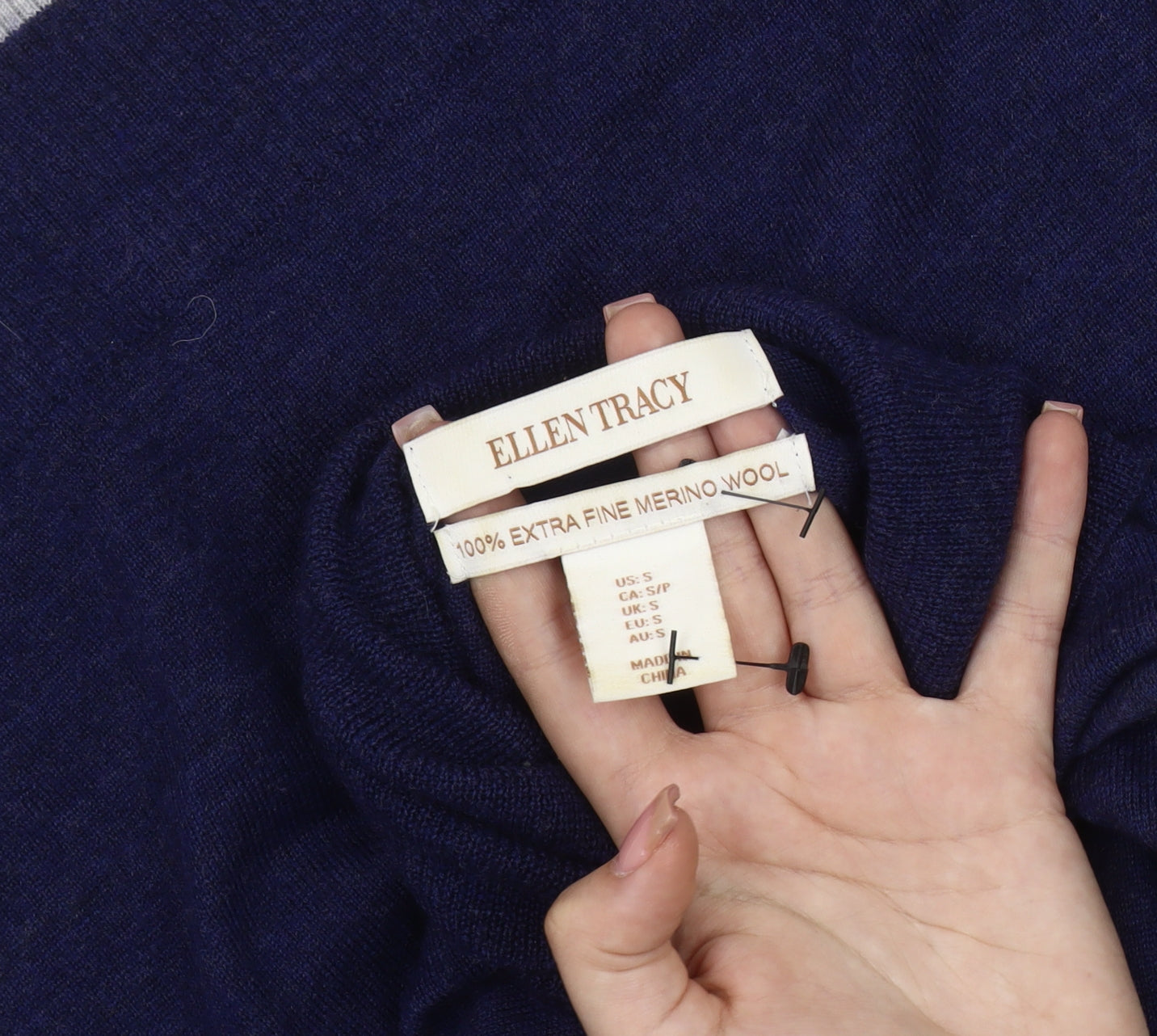 Elevate your wardrobe with this stylish Ellen Tracy women's jumper, perfect for adding a touch of elegance to your casual outings this season. Crafted from 100% extra fine Merino wool, this blue pullover offers a soft and comfortable fit, ensuring you stay warm while looking chic. Designed in a roll neck style, this jumper provides an added layer of warmth, making it an ideal choice for those chilly autumn and winter days. The jumper features short sleeves, making it a versatile piece that can be layered under a coat or worn solo to showcase its sleek and trendy style. With a tight-knit fabric type and classic knit style, this jumper is not only a fashion statement but also a durable addition to your wardrobe. Designed for regular fit and available in size S, it caters to a range of body types while maintaining comfort and style. The jumper's no-pattern design allows for easy pairings with various trousers or skirts, making it a staple in any fashion-forward wardrobe. Embrace the casual occasion this jumper is perfect for, whether you're heading to a weekend brunch or a low-key evening out. Its understated elegance speaks volumes without the need for accents or embellishments. Upgrade your autumn and winter wardrobe with this essential Ellen Tracy pullover jumper, where comfort meets style effortlessly.