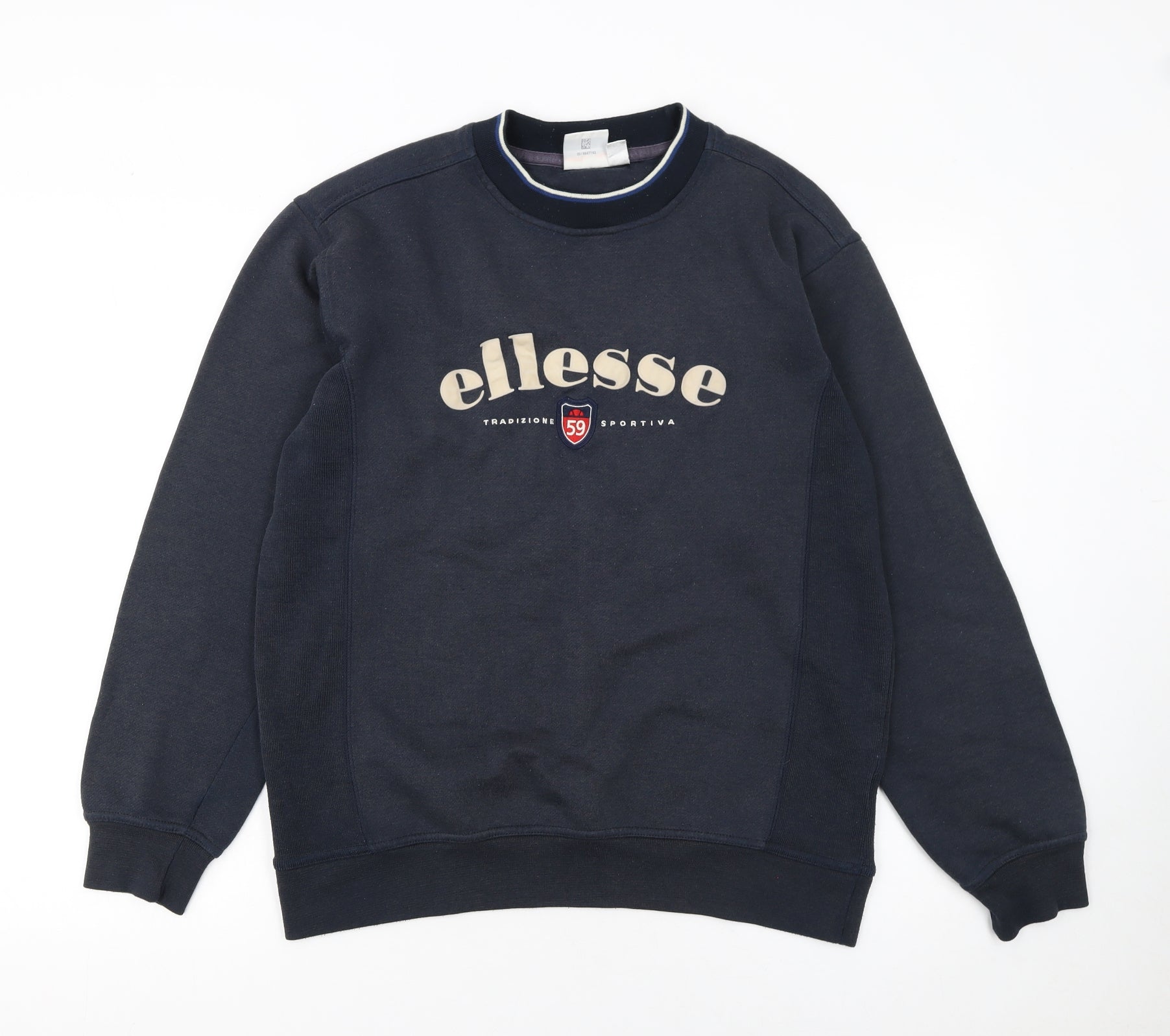 Refresh your casual style with this classic Ellesse men's pullover sweatshirt in a timeless dark blue shade. Designed for everyday comfort, it features the iconic Ellesse logo and 'Tradizione Sportiva' motif across the chest with a bold embroidered crest detailing that subtly celebrates the brand’s Italian sports heritage. Crafted from a soft cotton and polyester blend knit fabric, this sweatshirt provides warmth and breathability — ideal for layering throughout autumn, winter, and cooler spring days. The crew neckline and ribbed cuffs offer a snug, structured fit, while the regular cut ensures easy movement and a relaxed silhouette suitable for all body types. Perfect for gym sessions, football training, or laid-back evenings, it embodies sporty versatility with understated retro appeal. The long-sleeve design guarantees reliable coverage, making it a practical addition to any wardrobe. Combining quality materials with signature branding, this Ellesse sweatshirt blends athletic roots with urban streetwear flair. In excellent pre-owned condition with only minor wear visible on the logo, it retains its good looks and shape. Pair it effortlessly with jeans, joggers, or shorts for a complete casual outfit that delivers both comfort and timeless style. This versatile piece will quickly become a favourite for daily wear, whether heading to the gym, campus, or weekend outings. Enjoy the perfect balance of heritage design and modern leisurewear — an easy way to showcase both style and comfort.