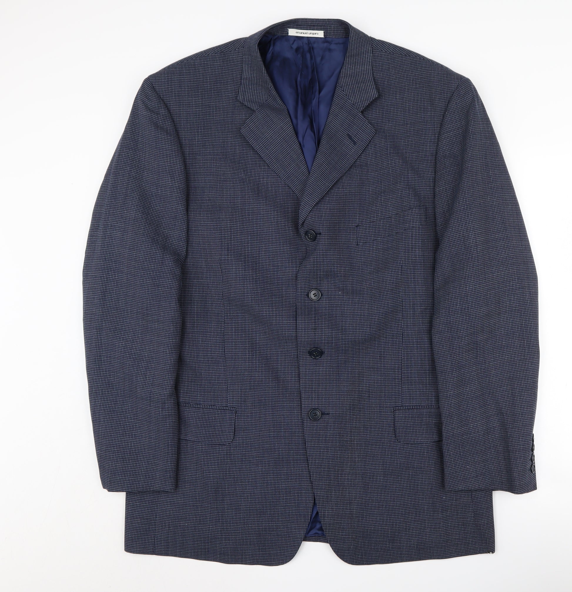 Elevate your wardrobe with this exquisite Emanuel Ungaro men's classic jacket. Perfectly tailored for a sophisticated appeal, this jacket is designed in a striking blue check pattern that effortlessly marries classic elegance with modern flair. Crafted from 100% wool, it provides superior warmth and luxury, making it an ideal choice for business meetings, formal events, or dining in style. The jacket features a sleek single-breasted design, adorned with a three-button closure and four-button sleeves, complementing its timeless aesthetic. Its notch lapel style further enhances the sophisticated look, while the long cut and double-vent design offer comfort and ease of movement. Designed for the regular-sized gentleman, it holds a classic fit that flatters the physique without compromising on comfort. This piece is perfectly suited for the autumn, spring, and winter seasons, providing adequate layering over your favourite dress shirt. The jacket requires dry cleaning to maintain its pristine condition and fine texture.Whether attending a formal event or making an impression at the office, this Emanuel Ungaro jacket promises to provide style and substance. Experience the embodiment of luxury with this wardrobe staple.