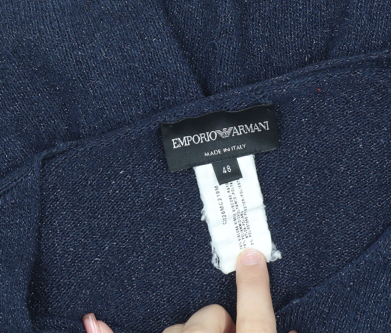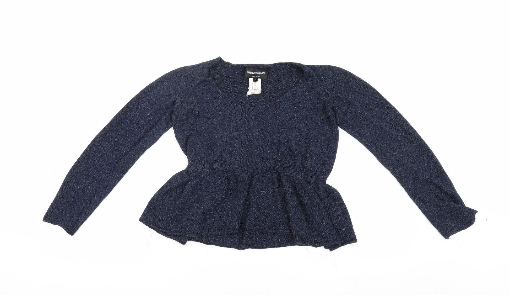 Elevate your wardrobe with this sophisticated Emporio Armani women's blouse. Crafted in a captivating blue hue, the top features a clean, solid pattern that exudes timeless elegance. Designed with long sleeves and a flattering round neck, it offers a cropped and stylish silhouette perfect for showcasing your fashion-forward sensibilities. Carefully constructed with a premium knit fabric blend of acrylic, wool, and polyester, this blouse promises both comfort and durability. Ideal for autumn and winter, its versatile nature allows for countless styling possibilities. Whether dressing up for a casual day out or adding a touch of luxury to your workwear ensemble, this blouse is a go-to choice. Please note signs of minor wear, yet in excellent condition. Discover the allure of Emporio Armani and make a chic statement wherever you go.