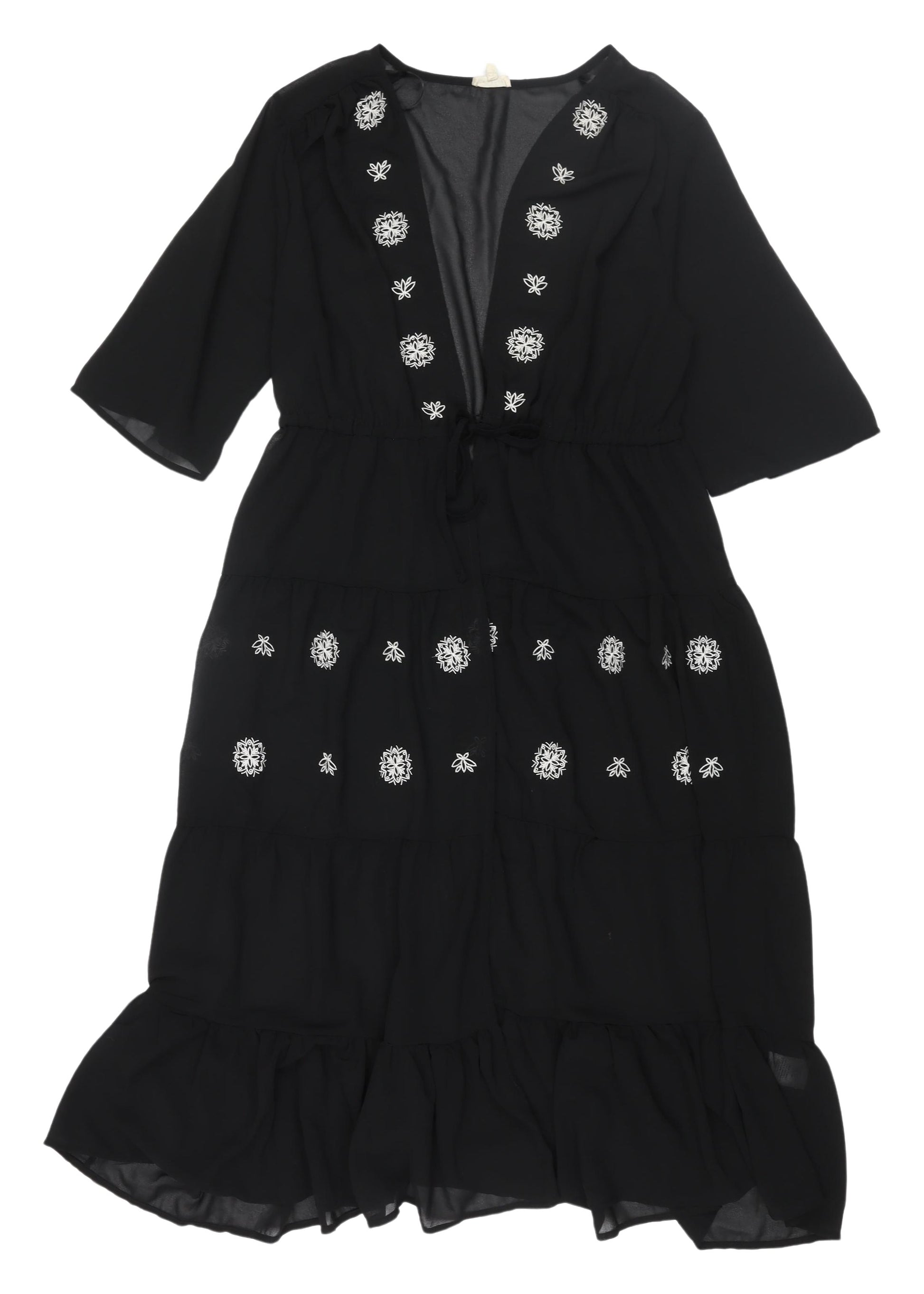 Enhance your wardrobe with this elegant black midi dress by En Crème, perfect for versatile styling. This women's dress comes in size S and is exquisitely detailed with white embroidery, adding a touch of sophistication to its minimalistic design. Made from quality polyester, it boasts a lightweight and airy feel, suitable for various occasions. With its 3/4 sleeves and comfortable midi length, it offers modesty while remaining fashion-forward. The drawstring closure allows for a flattering fit, making it ideal for casual outings or relaxed events. The deep black colour is both timeless and practical, ensuring this piece will be a staple in your closet. Don't miss out on this beautifully crafted dress that effortlessly combines style and comfort.