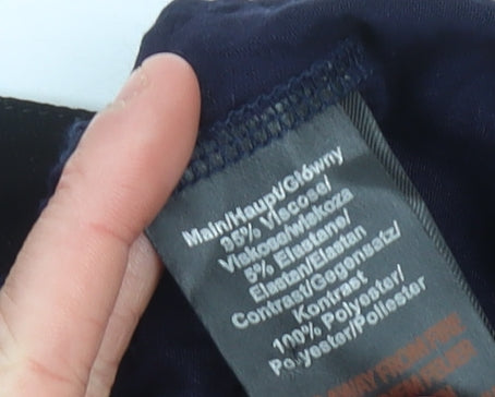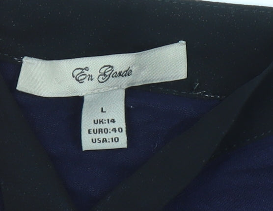 Add timeless elegance to your wardrobe with this En Garde blouse, crafted in a flattering tunic style that is both versatile and chic. Designed for women, this piece comes in a rich deep blue shade with contrasting black trim along the neckline, offering a sophisticated touch. The pullover design with a soft V-neckline creates a relaxed yet refined look, ideal for both casual outings and smart workwear styling. Featuring 3/4 roll tab sleeves with button detailing, it balances comfort and practicality beautifully, making it a suitable choice for seasons such as spring, summer, and autumn. Made from a blend of high-quality materials, the main body comprises 95% viscose and 5% elastane, ensuring lightweight breathability with a subtle stretch for ease of wear. The contrast panel is crafted from 100% polyester, which adds structure and a premium finish. The blouse’s solid pattern keeps it classic, while its lightweight jersey fabric type contributes to all-day comfort. Perfectly tailored in UK size 14 with a regular fit, it flatters without compromising on ease of movement. The pullover closure style means you can slip it on effortlessly, making it as practical as it is stylish.Whether you’re pairing it with tailored trousers for an office-ready ensemble or dressing it down with jeans for weekend wear, this blouse provides incredible versatility. Its elegant neckline and simple accents allow for layering with jewellery or scarves, while the lightweight design makes it a comfortable and breathable choice for all-day wear. This is an ideal selection for women seeking a quality blouse that offers modern style and everyday convenience. In very good condition with light wear and minor creasing, it remains an attractive and wearable garment perfect for enhancing your wardrobe.