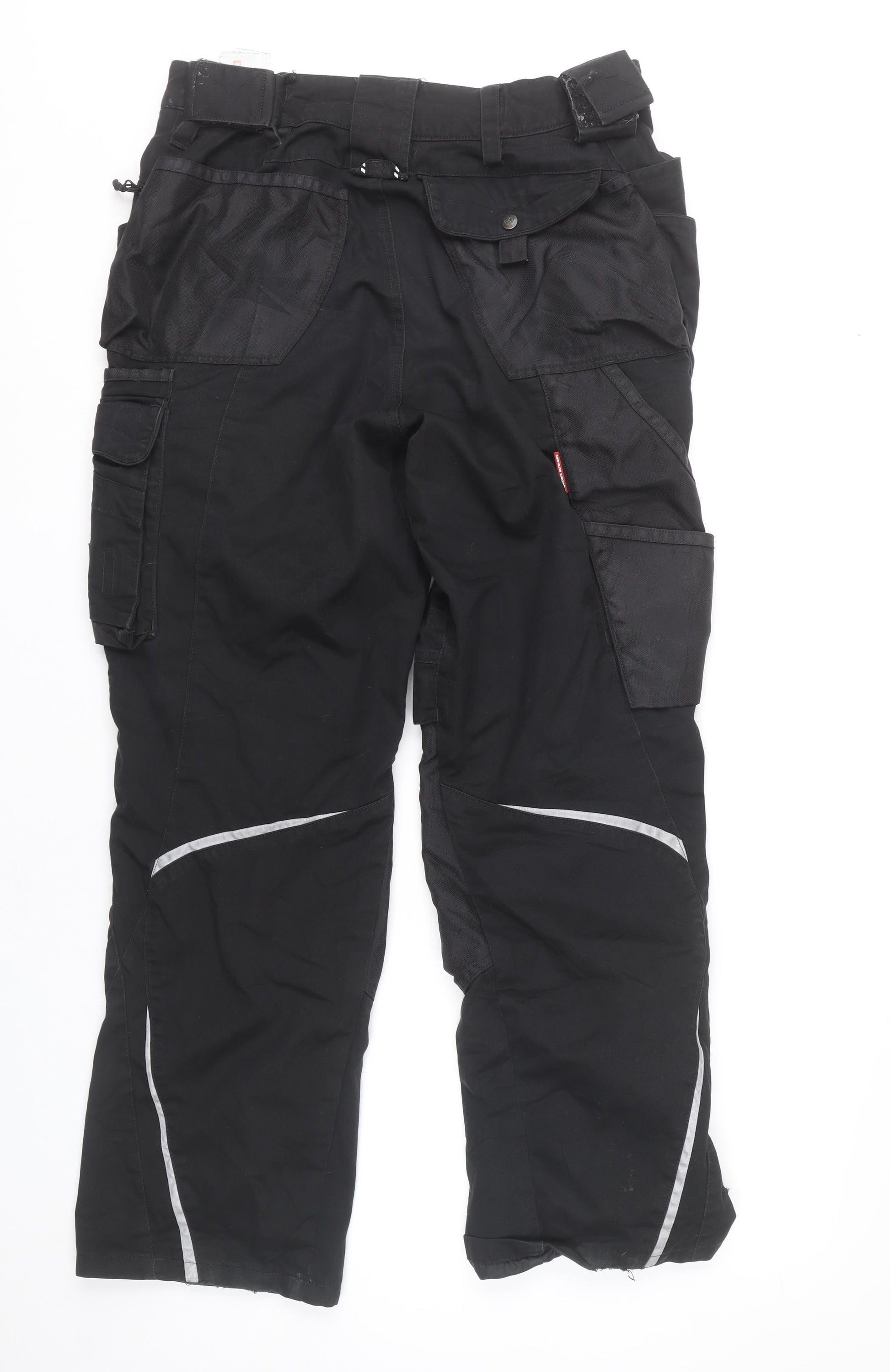 Tough, reliable and built for demanding work environments, these Engelbert Strauss men's black cargo trousers are the perfect ally for those who need durability without compromising comfort. Crafted from a blend of 65% polyester and 35% cotton, the trousers offer enhanced breathability along with long-lasting wear properties. Designed in a practical cargo style, they feature an array of functional pockets, including traditional slash pockets and secure cargo compartments, making them ideal for storing tools and essentials on the job. Reflective accents enhance visibility in low-light conditions, while the breathable material ensures all-day comfort in both autumn and winter conditions. The trousers present a straight leg style with a flat front for a clean, professional appearance and a mid-rise fit for everyday ease of movement. Closing securely with a button and zip fastening, they are machine washable for easy care. Perfect for workwear, construction, and outdoor use, these cargo trousers are as functional as they are stylish. The black colour ensures a versatile look that pairs effortlessly with work jackets, hoodies or polos. Despite being pre-owned, these trousers are in very good condition with only light signs of previous wear and some minor lint, maintaining their structural integrity and long-lasting quality. Whether you are looking for performance gear for the job site or robust trousers for outdoor activities, these Engelbert Strauss work trousers are a dependable choice that blends practicality with comfort. Get the professional edge and stay ready for any task with these high-quality cargo trousers.