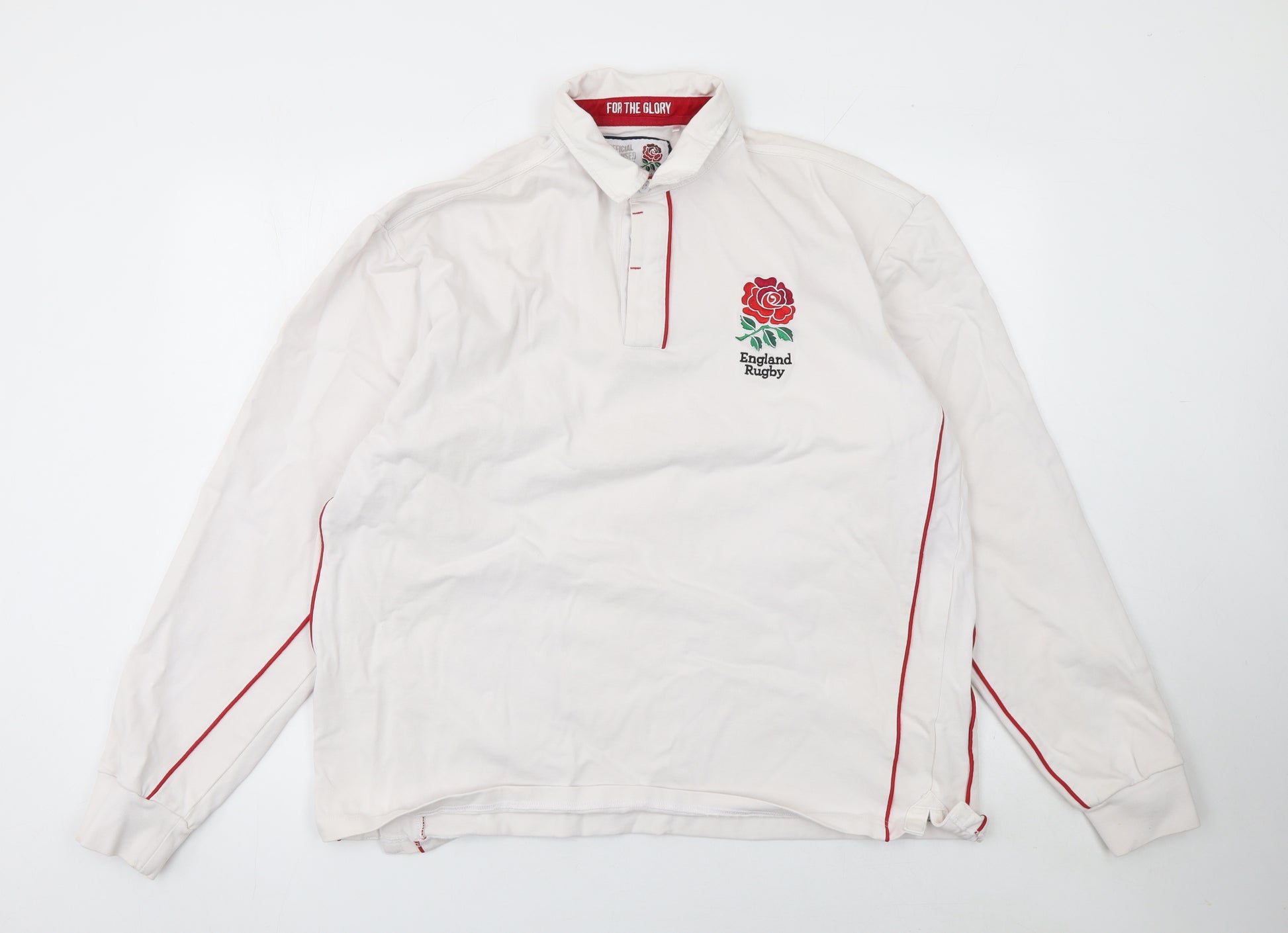 Show your national pride in this England Rugby men's white long sleeve polo shirt, perfect for both casual wear and active days. Crafted from 100% cotton, this high-quality jersey polo offers a comfortable and breathable fit, suitable for everyday use or light training sessions. The shirt features the iconic red rose England Rugby embroidered logo on the chest, symbolising heritage, strength, and team spirit, while subtle red piping adds a sporty edge to its clean classic look. The button-down collared neckline enhances its structured style, blending the smart essence of a polo with athletic functionality. Designed in a solid white colourway, it delivers timeless versatility — easy to pair with jeans, chinos, or shorts. The relaxed, regular fit provides ease of movement whether cheering from the stands, heading out for a casual outing, or enjoying a laid-back weekend. Its long sleeves and comfortable cotton construction make it ideal for transitional seasons like spring and autumn, and its breathable fabric ensures comfort in every wear. Despite light signs of previous wear and a minor mark on the front, this item remains in very good condition — freshly washed, well-maintained, and still full of charm. This piece captures everything a rugby fan could want: comfort, quality, and national pride in equal measure. For those who appreciate understated sporty style, it’s a versatile addition to any wardrobe. Machine washable for easy care, this England Rugby polo shirt is a great find for collectors and supporters alike. Whether worn on match days or just showing your team spirit, this shirt makes an excellent wardrobe staple for any rugby enthusiast who values British sporting heritage.