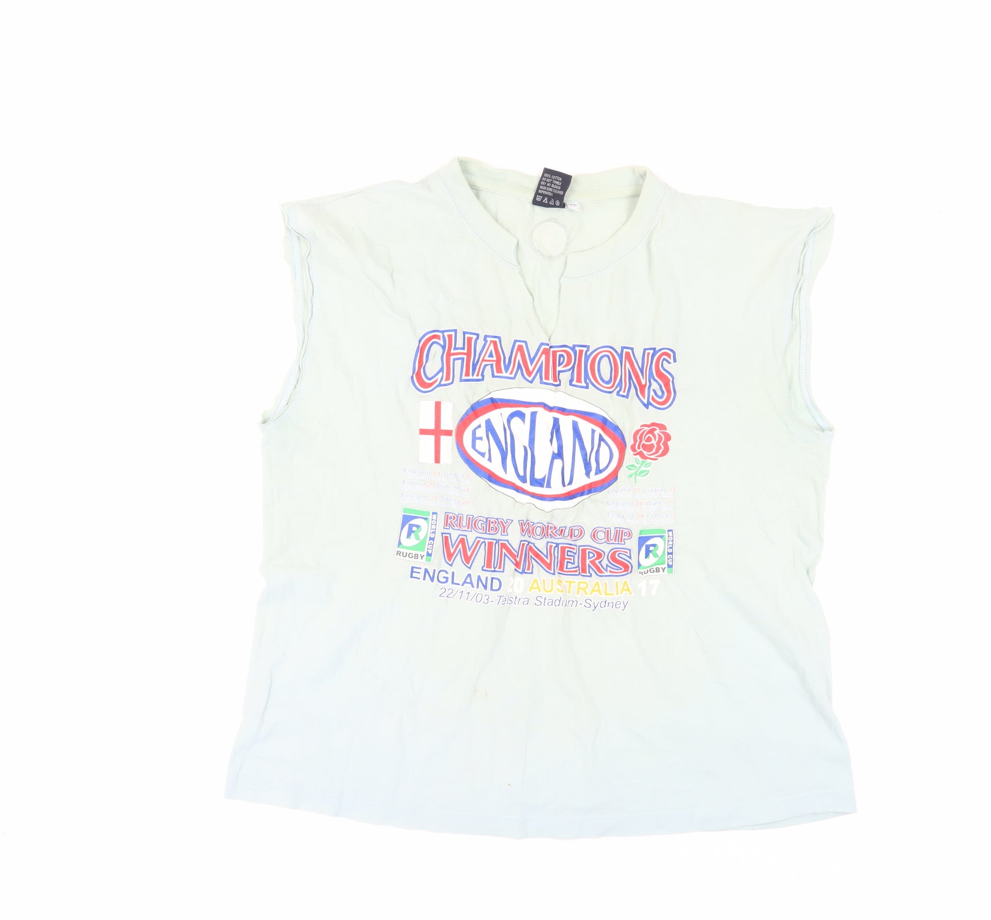 Celebrate your love for sports with this unique vintage England T-Shirt. Perfect for those who appreciate a blend of patriotic flair and casual style, this piece stands out with its retro design and comfortable fit. Made from 100% cotton, it offers a breathable feel suitable for summer days or layering in cooler weather. The solid white base is adorned with striking graphic prints, showcasing a love for England's sporting triumphs. Designed for a unisex fit, the sleeveless cut provides a relaxed and easy-going silhouette. The round neckline adds a classic touch, making it a versatile addition to any wardrobe. Ideal for casual occasions, this T-shirt is machine washable, ensuring convenient care and longevity. Despite being a vintage piece, it retains its charm with only minor signs of wear, including small stains on the front. Priced affordably, it’s a must-have for collectors or anyone looking to add a piece of history to their attire. Dive into the moment with style, comfort, and an unmistakable nod to sporting heritage.