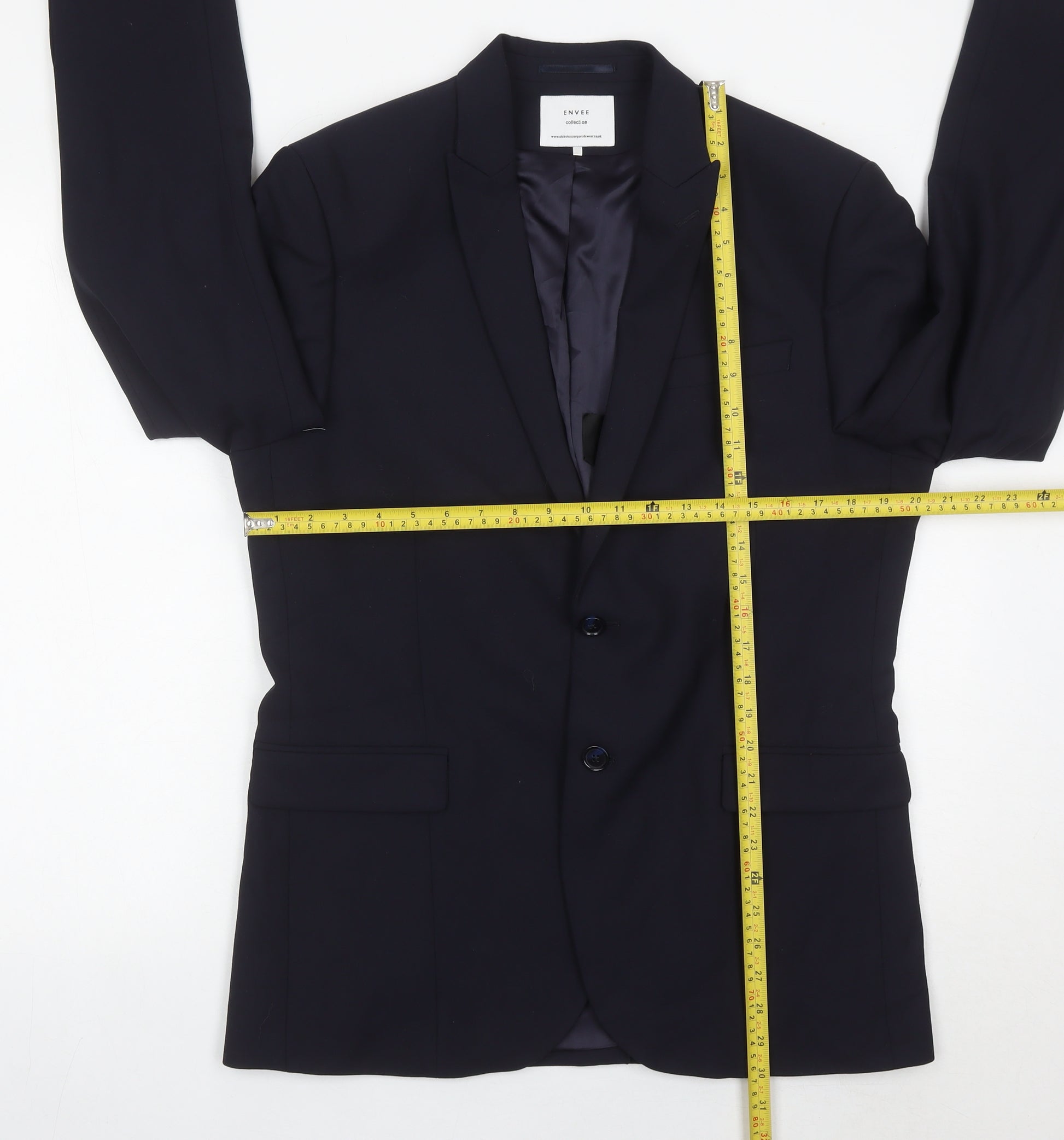 Elevate your formal and business wardrobe with this sophisticated men's suit jacket from the EnvEe Collection. Tailored in a sleek navy blue shade, this single-breasted jacket offers a timeless design ideal for multiple occasions, including business, weddings, formal gatherings, and smart evening events. Constructed in a regular fit, it balances modern tailoring with all-day comfort, ensuring a polished yet practical look for the discerning gentleman. Crafted from a high-quality blend of 68% polyester, 28% viscose, and 4% elastane, the jacket provides durability with a touch of stretch for enhanced movement. This carefully chosen fabric combination ensures breathability while maintaining a sharp silhouette. Internally, the jacket is lined with polyester and viscose materials for added structure and comfort. The rich navy shade offers versatile styling opportunities, pairing effortlessly with a wide range of shirts, ties and trousers, making it a go-to wardrobe essential. This 40R (UK) chest size design features a notch lapel for a clean, classic finish and a two-button front fastening that enhances the structured look. Four-button detailing at the sleeve cuffs adds to its refined presentation, while practical touches include discreet inner pockets to keep essentials secure. The single-vented back offers flexibility and ease of movement, making it both stylish and functional. Ideal for year-round wear, this EnvEe jacket adapts seamlessly to every season – whether worn over a crisp shirt for spring and summer business attire, or layered under a heavier coat during autumn and winter events. Its sleek, minimalist design allows it to remain a timeless staple in any gentleman’s collection. Condition is very good, showing minimal signs of previous wear with no major flaws, making it a fantastic choice for those seeking smart tailoring at excellent value. Perfect for professionals looking for refined corporate attire, groomsmen needing sophisticated wedding wear, or anyone hoping to refresh their formalwear rotation with a versatile navy jacket. Upgrade your wardrobe with this stylish and dependable EnvEe Collection navy suit jacket that combines durability, comfort, and classic elegance.