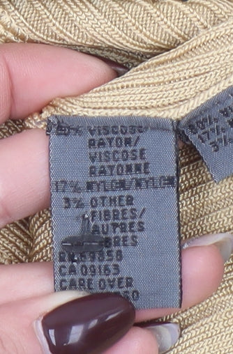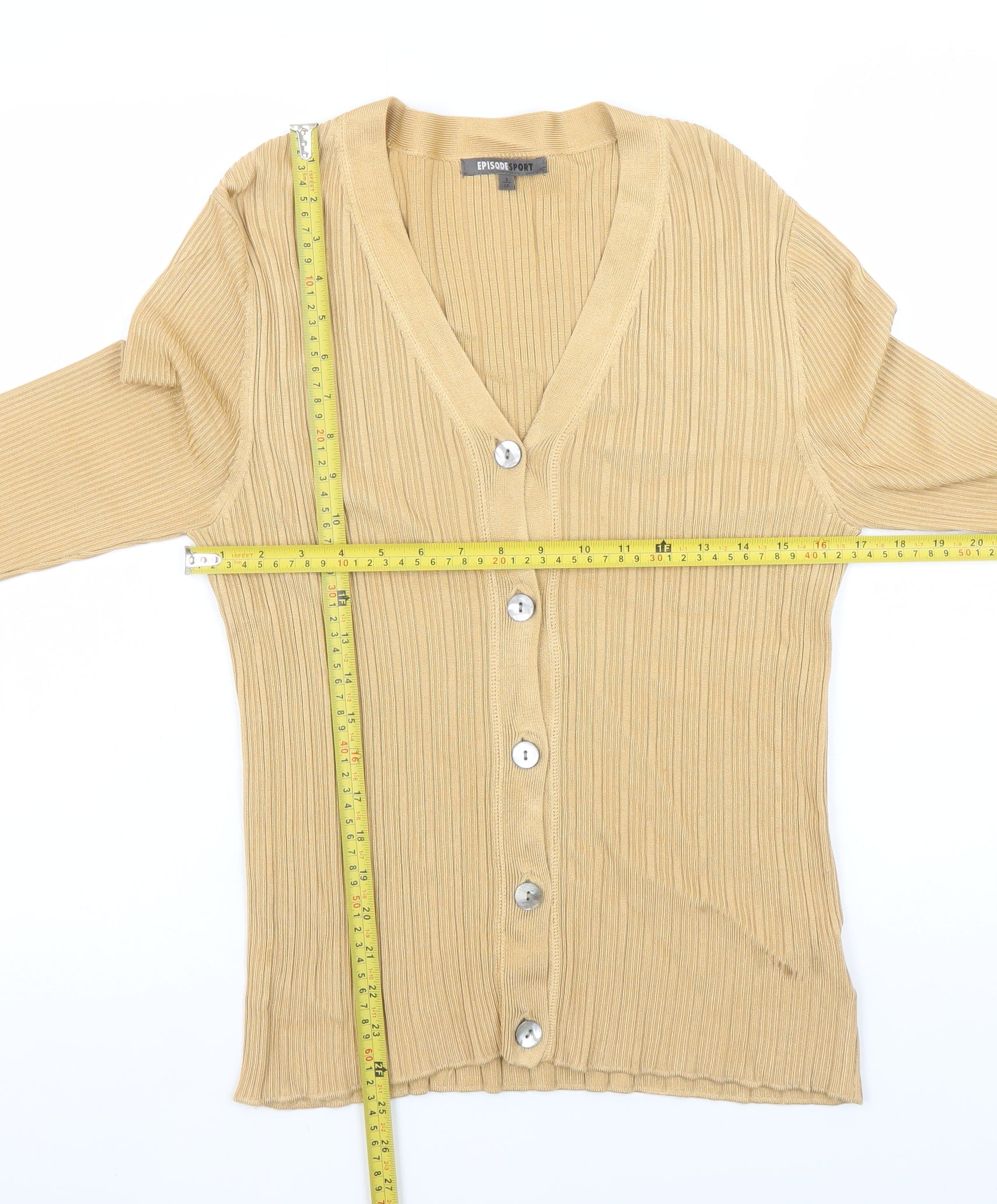 This elegant beige ribbed knit cardigan by Episode Sport offers a timeless and versatile addition to any woman’s wardrobe. Crafted from a soft blend of viscose and nylon, it combines breathability, stretch, and lightweight comfort for all-day ease of wear. Designed with a flattering slim fit, this classic V-neck cardigan creates a smooth silhouette that layers beautifully over tops or dresses. The front features a full button-up fastening with attractive buttons, adding a subtle accent to its minimalist aesthetic. The ribbed knit texture enhances the cardigan’s form-fitting shape, providing both structure and flexibility for effortless movement. Ideal for casual or light workwear, the cardigan is perfect for layering during the autumn and spring seasons, offering a polished yet laid-back look. The long sleeves lend warmth, while the breathable fabric ensures comfort across changing weather conditions. Suitable for a variety of occasions, from relaxed weekends to smart-casual office wear, it pairs effortlessly with jeans, skirts, or tailored trousers. In excellent pre-owned condition with minimal signs of gentle wear, this Episode Sport cardigan maintains its shape and quality without visible flaws. A classic neutral tone makes it easy to coordinate with other wardrobe pieces, creating both contemporary and timeless outfits. With its simple yet chic design, this piece represents understated style and comfort ideal for everyday elegance. Affordable and versatile, it’s a must-have layering staple for those who appreciate effortless sophistication and quality craftsmanship.