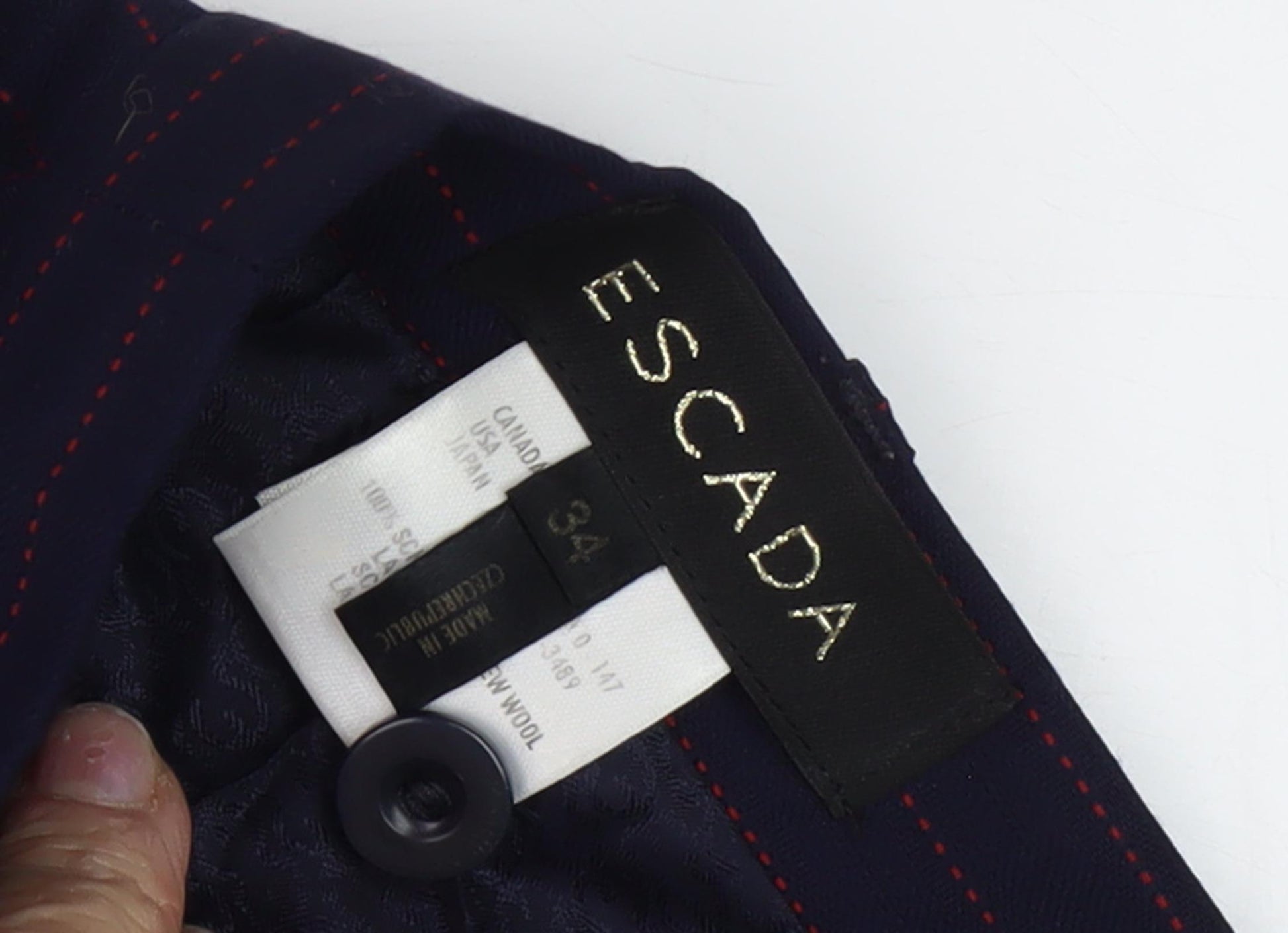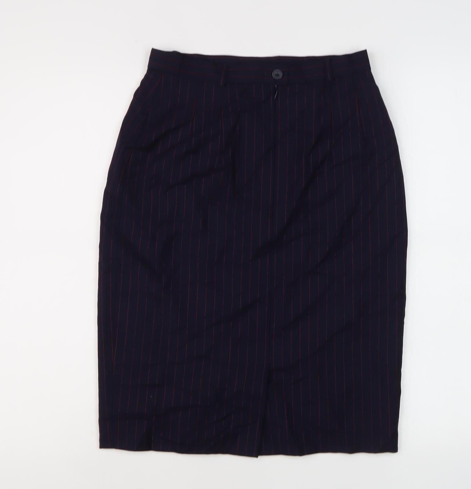 Step into sophistication with this classic Escada women's black wool pencil skirt, perfect for any business setting. With its sleek, knee-length cut and timeless striped pattern, this skirt offers a refined and polished look. Made from 100% wool, it provides warmth and comfort for the colder autumn and winter months. The skirt is beautifully lined, ensuring a smooth silhouette and luxurious feel against the skin. Designed with a button closure, this elegant piece effortlessly combines practicality with style. Suitable for a variety of occasions, from boardroom meetings to formal events, this skirt is a versatile addition to any wardrobe. Wear it with a crisp blouse and heels for a truly professional ensemble. Despite being pre-loved, the skirt remains in excellent condition, with no visible damage, highlighting its durability and quality craftsmanship. Elevate your fashion game with this meticulously crafted piece, guaranteed to enhance your style and confidence at a fantastic price.