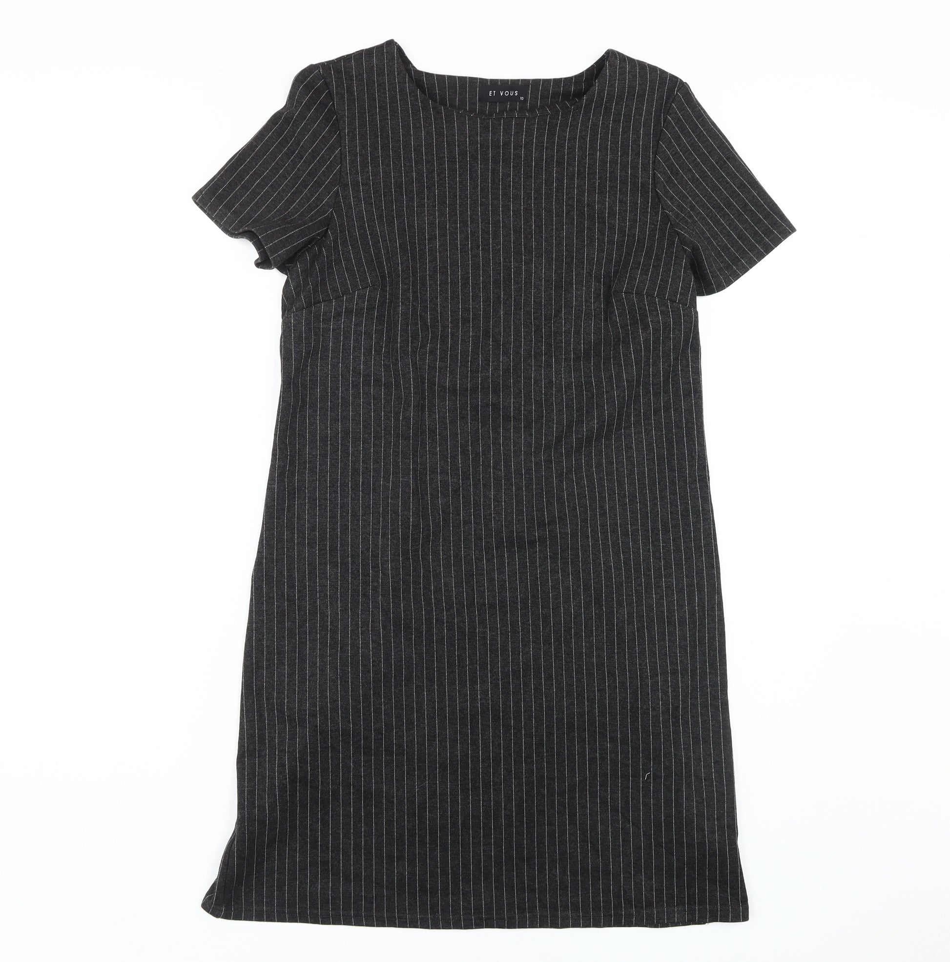 Elevate your wardrobe with the Et Vous Women's Black Striped Shift Dress. Designed for both style and comfort, this dress is crafted from a blend of viscose, polyester, and elastane, ensuring a soft, stretchable fit for your everyday essentials. The jersey fabric is adorned with a classic black stripe pattern, offering a timeless appeal to your ensemble. Featuring a short sleeve design and a round neckline, this dress provides a flattering silhouette. Its size 10 fit is perfect for regular sizing, allowing you to step out in confidence. The shift style makes it suitable for various occasions, whether you're heading to a casual brunch or an informal gathering. Although the dress is in excellent condition, it shows no signs of brand sales tags, making it an ideal choice for those looking for quality at a fraction of the price. Offered at only £15.00, this dress presents an opportunity to add a versatile piece to your collection. Despite the absence of explicit dress length and occasion details, it's a smart pick for any woman seeking understated elegance. The Et Vous dress captures the essence of contemporary fashion with its simple yet sophisticated design. Suitable for work, casual outings, or even a day of leisure, it promises to be a valuable addition to your closet, allowing you to express your style effortlessly.