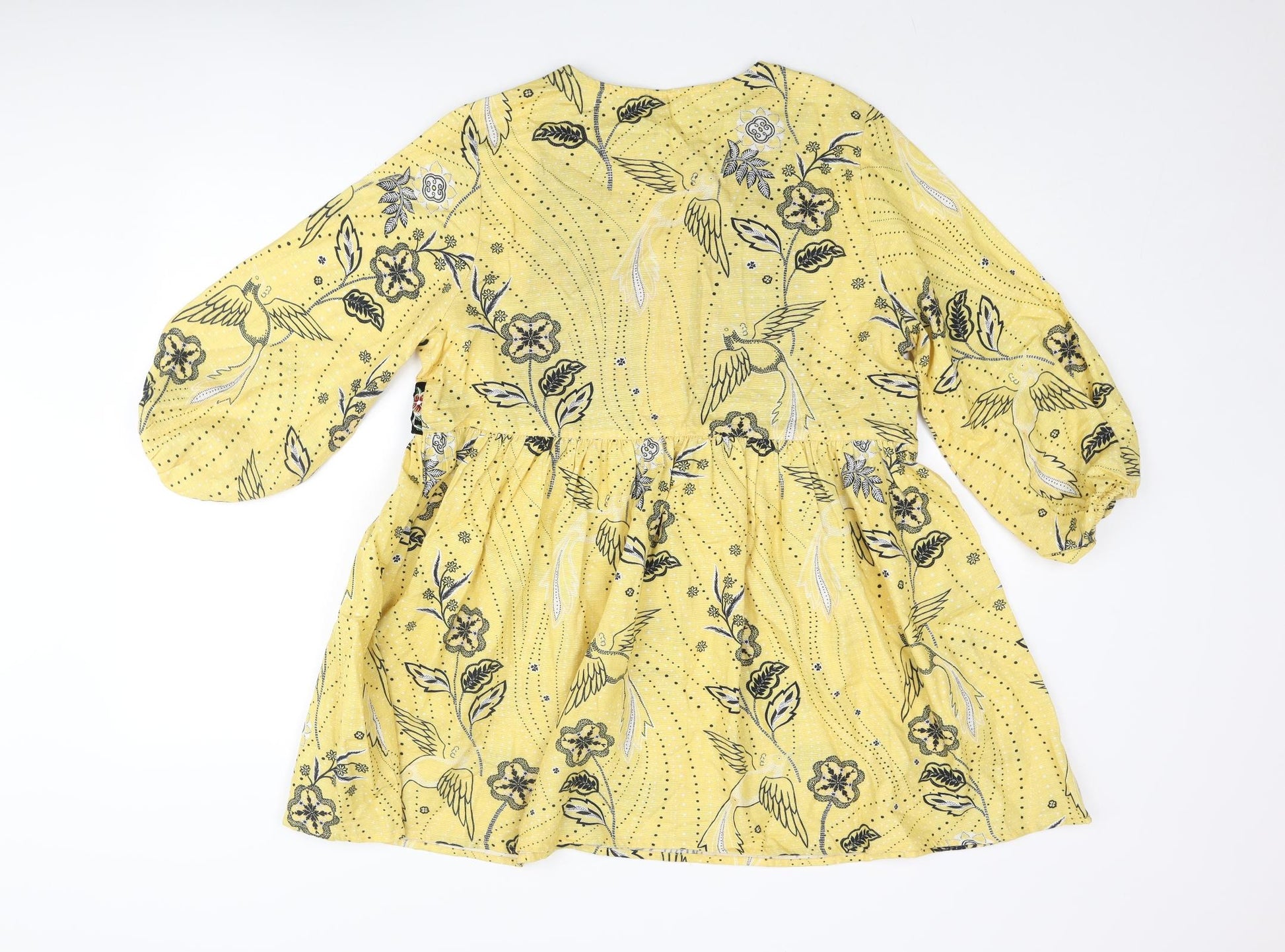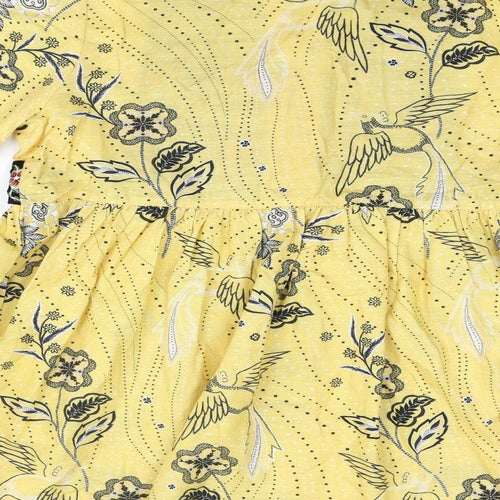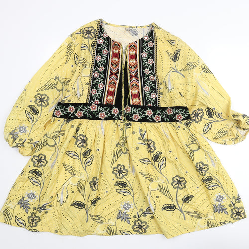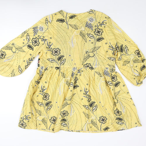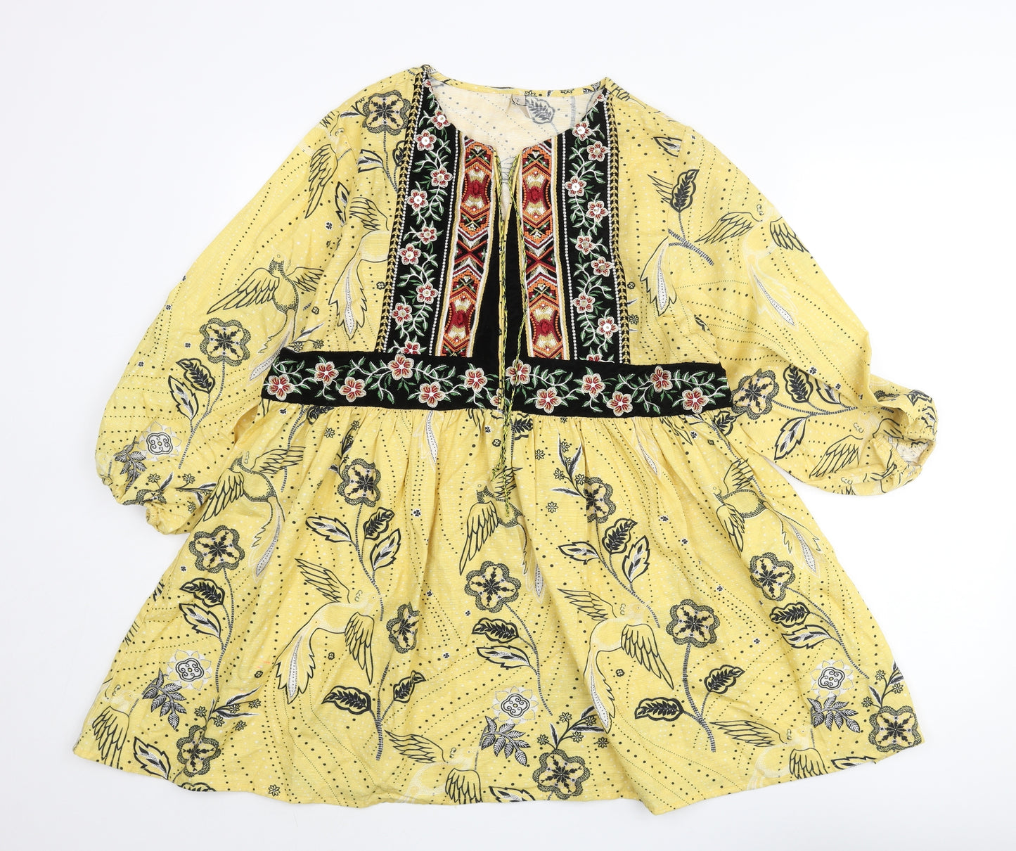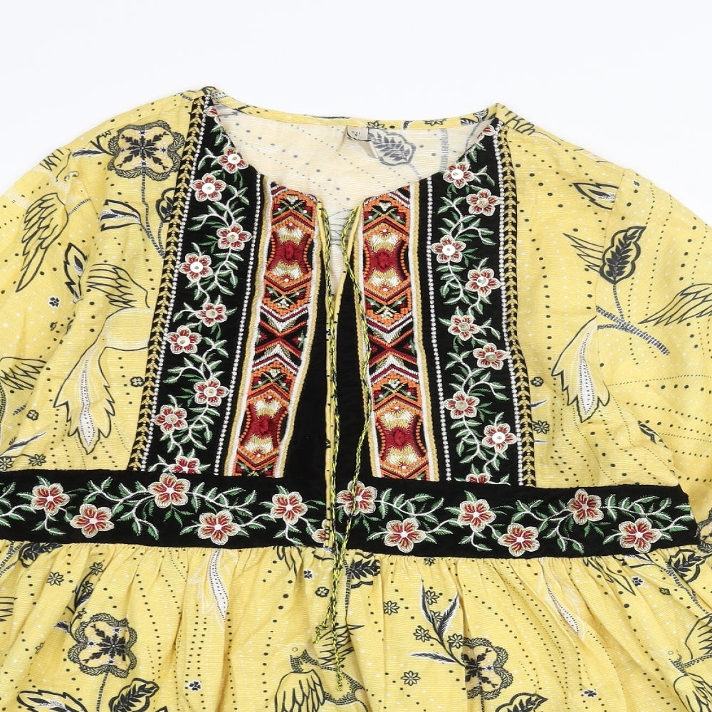 Womens Yellow Geometric Cotton Basic Blouse Size S V-Neck - Floral Embroidery