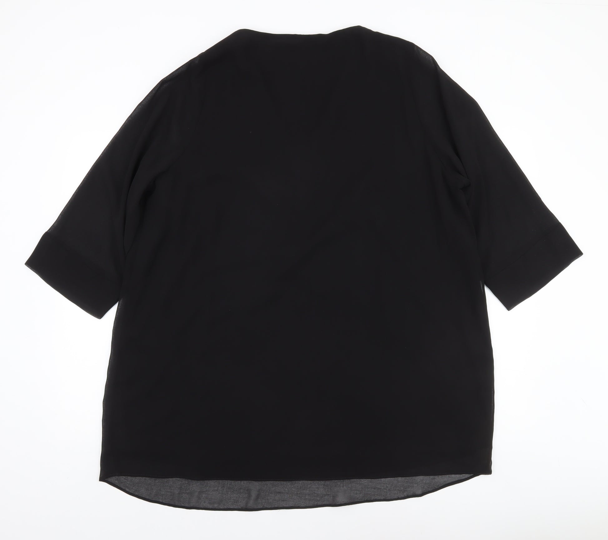 This elegant black tunic blouse from Evans offers a refined yet easy-to-wear addition to your wardrobe. Designed for plus-size women, this piece in a UK size 22 provides a comfortable relaxed fit that drapes beautifully. Crafted from 100% woven polyester, the material feels lightweight while maintaining a structured look that flatters the figure. The blouse features a classic V-neckline delicately accented with beaded detailing that lends a touch of understated glamour—perfect for both casual gatherings and evening events. The 3/4 length sleeves provide versatile coverage suitable for transitional seasons such as spring, autumn, and even winter when layered under a jacket. The solid black colour complements any wardrobe, pairing effortlessly with jeans, tailored trousers, or a smart skirt. A pullover design ensures ease of wear, while the lined construction enhances comfort and quality. This tunic-style blouse reflects a timeless style that blends sophistication with everyday practicality, making it ideal for both casual days out and party or cocktail settings. The Evans brand is renowned for crafting stylish, inclusive designs that celebrate comfort and confidence, and this blouse exemplifies that ethos. In excellent pre-loved condition with no visible flaws, this top represents both quality and value. Machine washable for easy care, it fits seamlessly into your daily rotation. Treat yourself to a wardrobe staple that combines effortlessness and elegance in one versatile piece. Whether worn alone or accessorised, this black beaded blouse is bound to become one of your go-to favourites, offering you confidence and timeless appeal every time you wear it.