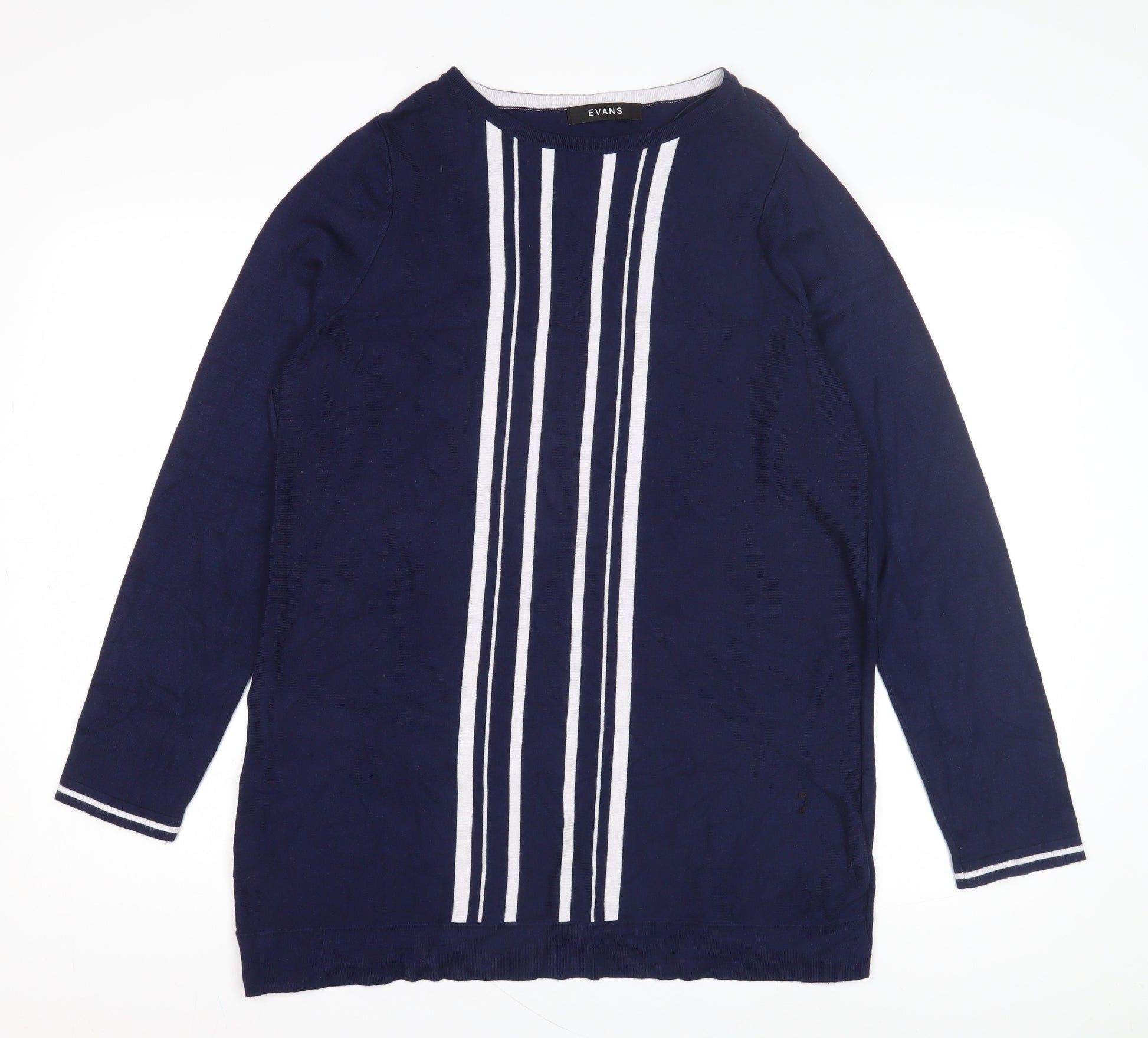 Upgrade your casual wardrobe with this stylish Evans Women's Blue Striped Pullover Jumper. Crafted from 100% cotton, this knit jumper promises comfort and breathability, perfect for those cooler autumn and spring days. The relaxed fit and long sleeves ensure ease of movement, making it an ideal choice for everyday wear. Featuring a classic round neckline, this jumper is easy to pair with jeans or casual trousers for a chic yet casual look. Its eye-catching blue colour with vertical white stripes adds a touch of elegance and makes it a versatile piece for various occasions. Whether you're heading to a casual brunch or a weekend outing, this jumper keeps you looking effortlessly chic. Easy to care for with machine washable instructions, this Evans piece is a practical and fashionable addition to any wardrobe. Despite being gently used, it remains in excellent condition, ready to offer style and comfort to its new owner. At an affordable price, it provides great value along with timeless style.