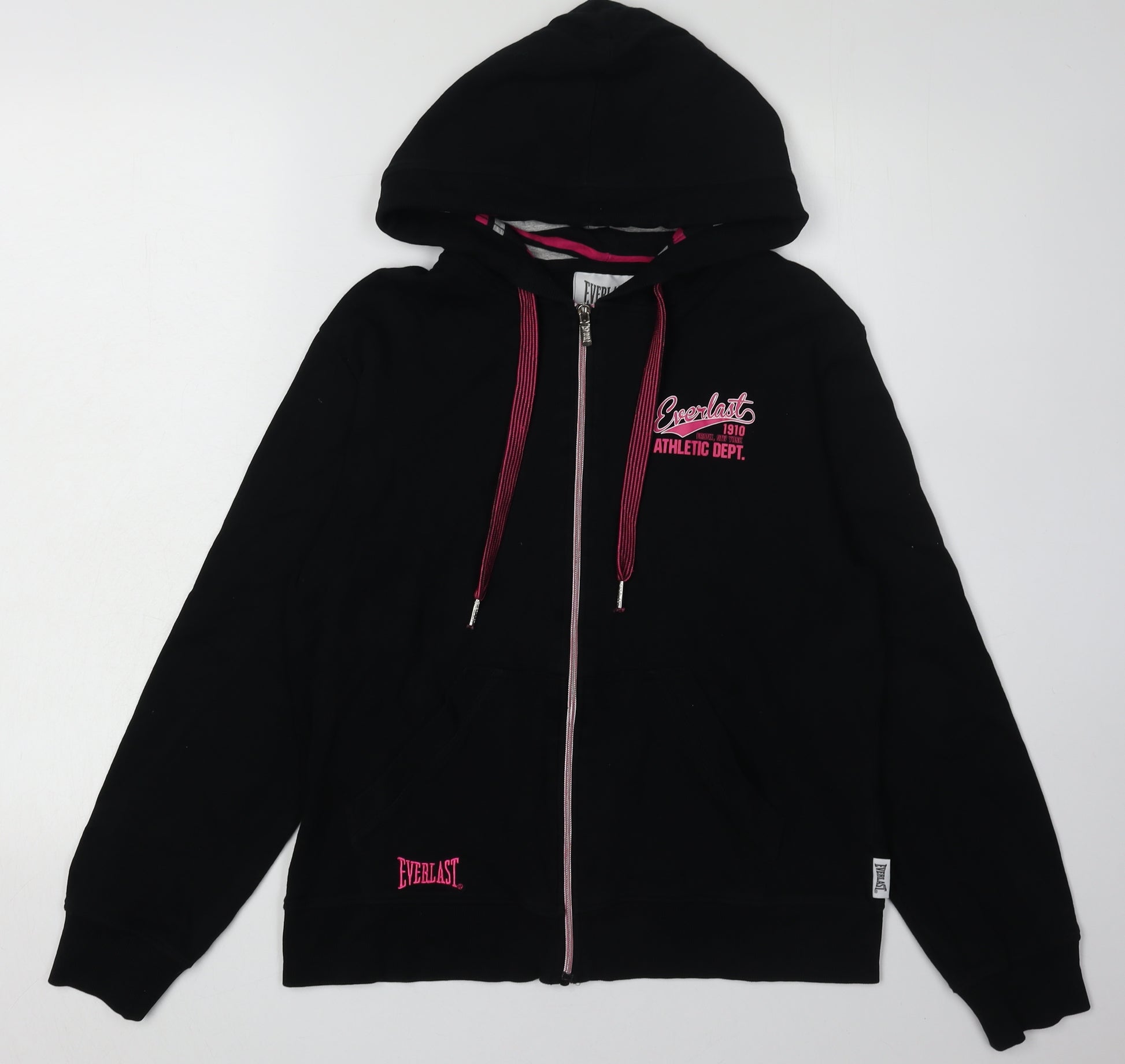 Elevate your gym and casual wardrobe with this sleek Everlast Women’s Black Full Zip Hoodie. Perfectly designed for athletic and casual styles, this hoodie is an essential piece for any fashion-forward individual keen on comfort. Crafted from 100% cotton, it ensures a soft touch on the skin, making it breathable for all-day wear. The classic black colour gives a versatile edge, blending effortlessly with various outfits.Featuring a convenient full zip closure, this hoodie is easy to wear and remove, making it ideal for those quick changes at the gym or on-the-go. The hooded design provides added warmth and style, ensuring you stay snug during chilly days. With a regular fit, it offers comfort and ease of movement, perfect for gym & training sessions.The unique logo accent adds a stylish touch, while its regular size and long sleeves comfortably fit women of size 12. Designed with a focus on functionality and style, this hoodie is your go-to piece for both workouts and relaxed outings.Its machine washable attribute ensures fuss-free maintenance, making it a practical addition to your activewear collection. Whether you're heading for a workout or a casual day out, this versatile piece promises to keep you looking chic and feeling comfortable.Invest in quality and style with this Everlast full zip hoodie, a must-have staple ensuring you always look your best effortlessly.