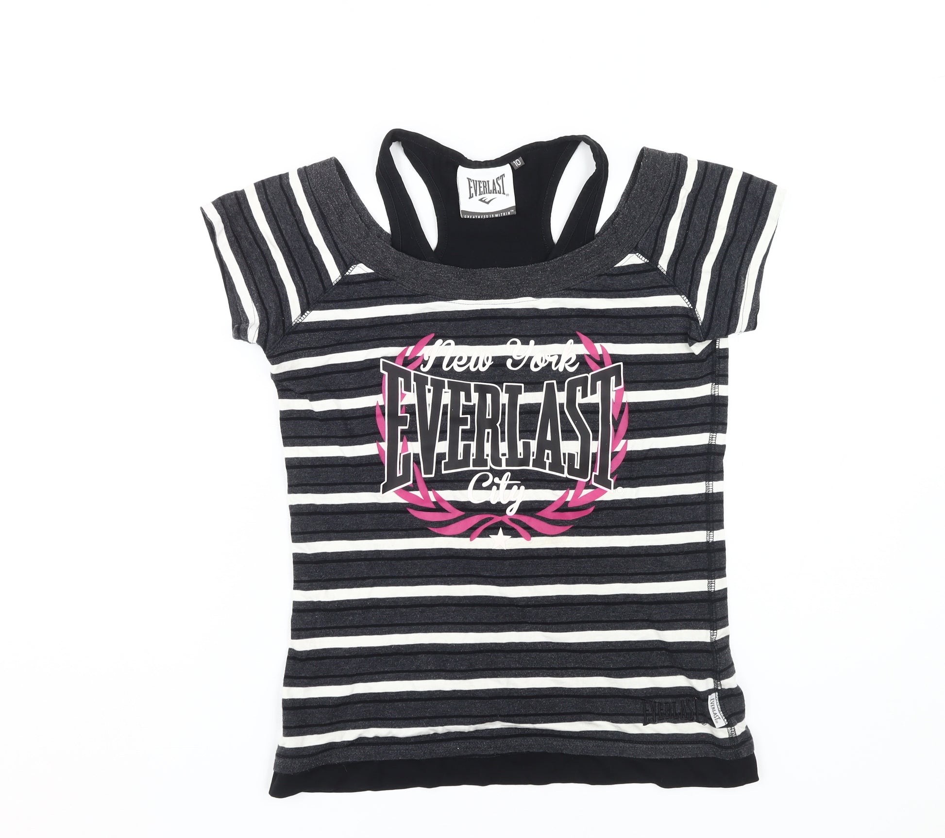 Elevate your casual wardrobe with this stylish Everlast Women's Black Striped T-Shirt in size 10. Perfect for a relaxed yet chic look, this basic t-shirt features a classic crew neck and short sleeves, making it a versatile piece for your everyday outings. The black and white striped pattern adds a dash of trendiness while maintaining a timeless appeal that's easy to pair with any outfit. Crafted from a comfortable jersey fabric, this t-shirt ensures all-day wearability. Suitable for any season, this top is ideal for casual occasions, whether you're heading to the park, the gym, or just relaxing at home. Easy to care for, it’s machine washable, making it a practical addition to your wardrobe. Add this essential piece to your collection and enjoy the perfect blend of comfort and style.