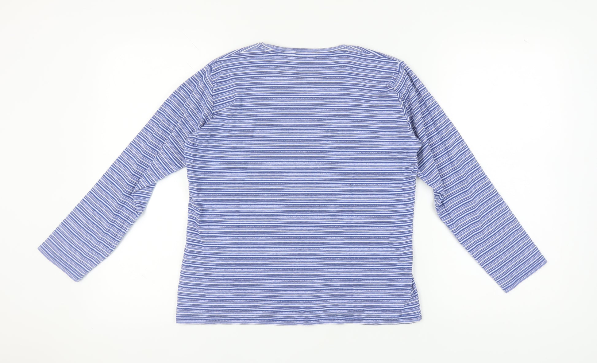 Elevate your casual wardrobe with this classic EWM Women's Blue Striped Long Sleeve T-Shirt. Perfectly tailored for a relaxed and comfortable fit, this medium-sized T-shirt features a timeless crew neck design and striking blue hues in a striped pattern. Made from 100% cotton, it offers a soft, breathable feel ideal for autumn and winter wear. Whether you're running errands or enjoying a laid-back weekend at home, this stylish top ensures you look chic with minimal effort. With long sleeves and a regular fit, it's both practical and versatile, allowing you to dress it up or keep it casual. Despite being in excellent used condition, the garment displays minimal signs of wear, making it a sustainable, budget-friendly choice for fashion-conscious shoppers. Pair it with your favourite jeans or skirt for a laid-back yet fashionable look. Ideal for casual occasions, this knit fabric T-shirt offers the perfect blend of comfort and style, ensuring you feel confident wherever the day takes you. Don't miss the opportunity to add this must-have piece to your wardrobe.