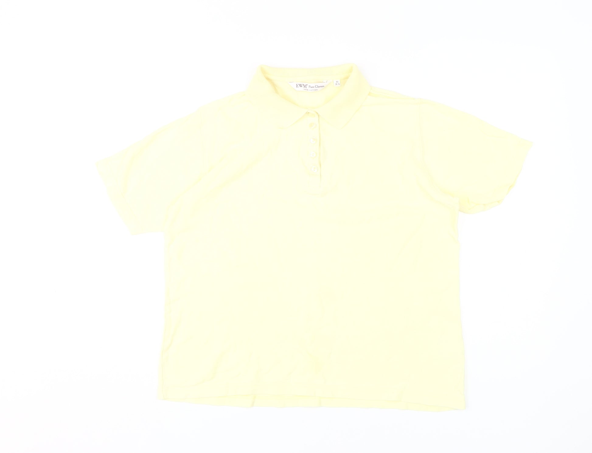 Enhance your casual wardrobe with this EWM Women's Polo Shirt in a delightful shade of yellow. Crafted from 100% cotton, this polo provides both comfort and style for everyday wear. The collared neckline and button closure give it a classic look, while the short sleeves offer a relaxed fit, perfect for warmer days. This medium-sized shirt suits a regular fit, ensuring a flattering silhouette. Ideal for various occasions, whether you're out on a casual day or relaxing at home, it fits seamlessly into your daily routine. Easy to care for with machine washable material, you’ll find this polo to be a low-maintenance yet stylish piece. While in excellent used condition, it displays no visible stains or tears, making it a reliable addition to your closet. Pair it with jeans, shorts, or skirts for a versatile look that transcends seasons. Invest in quality and comfort with this elegant yellow polo from EWM, perfect for all-year-round wear.