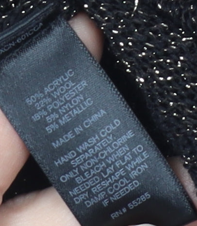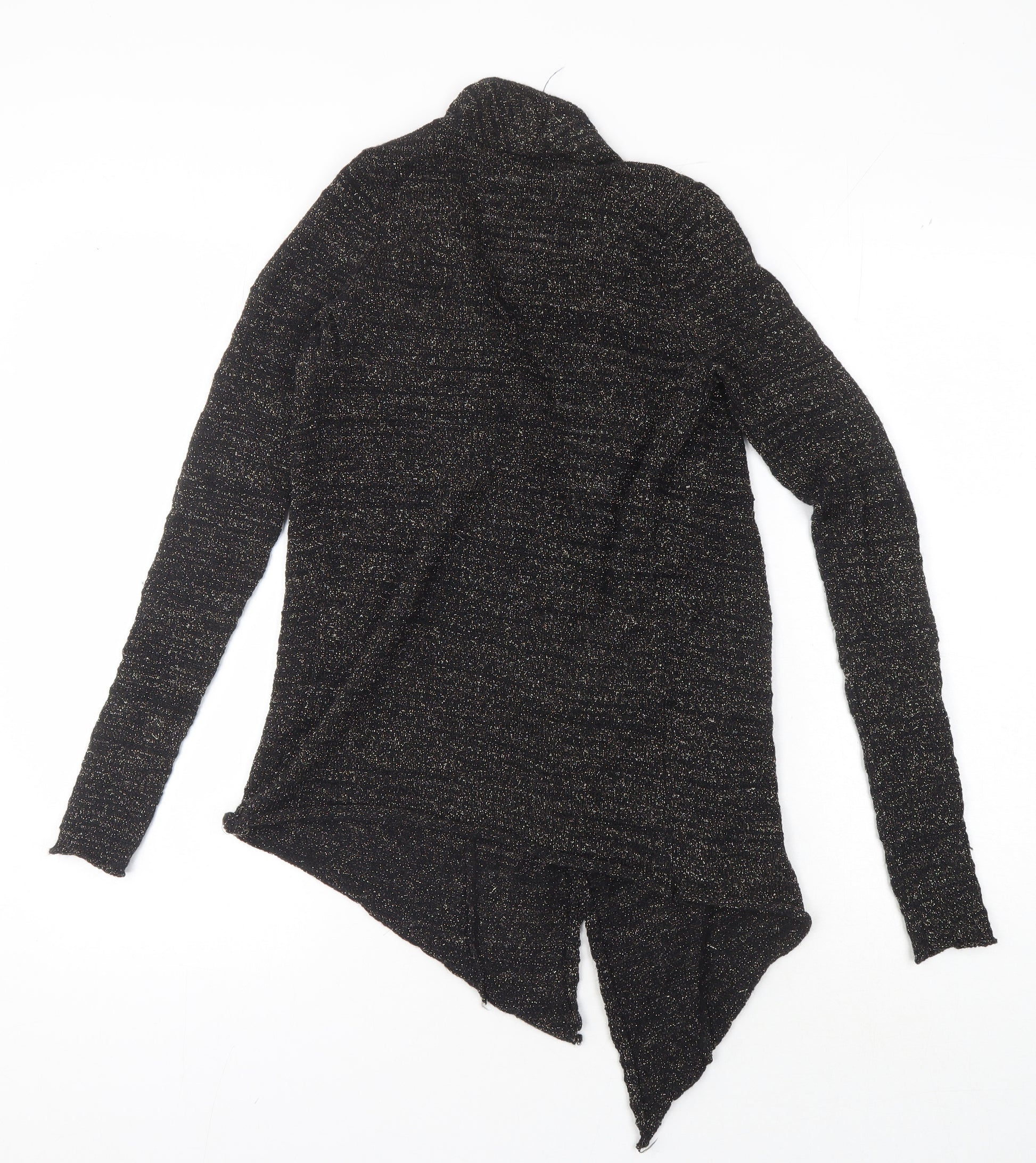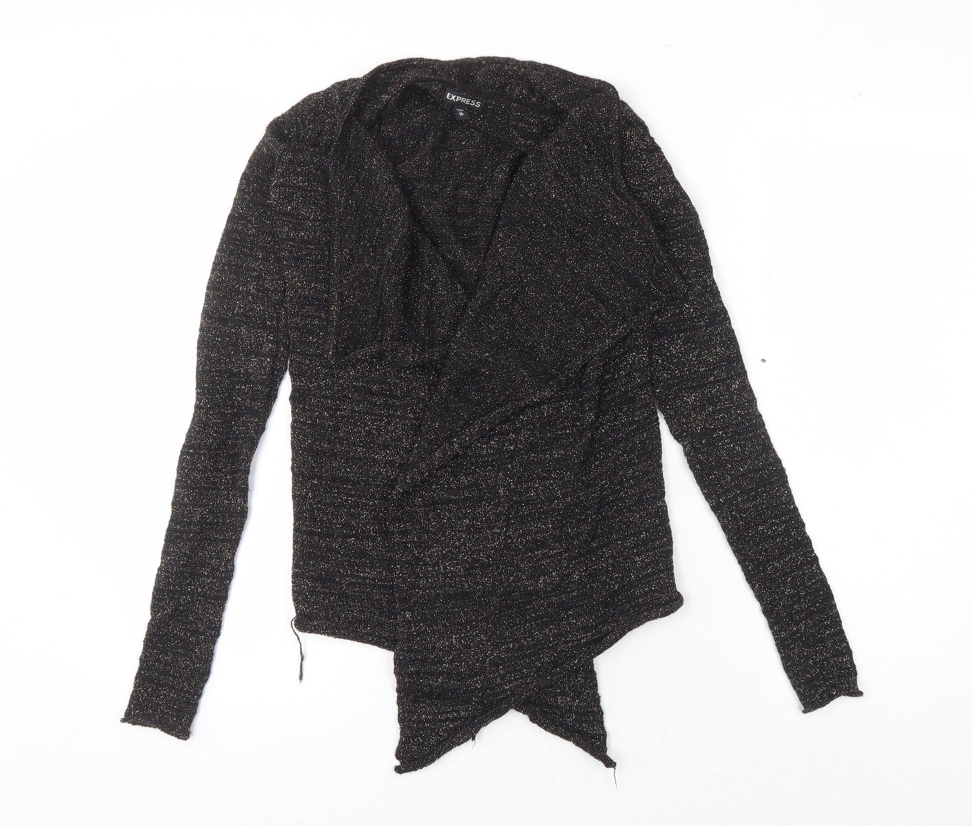 This chic black cardigan for women by Express is perfect for adding a touch of elegance to any casual outfit. Crafted from a luxurious blend of acrylic, wool, viscose, polyester, nylon, and metallic fibers, this lightweight cardigan offers comfort and warmth while maintaining a stylish silhouette. The long sleeves and open front design make it versatile for layering over your favourite tops or dresses. Its metallic finish adds a subtle shimmer, giving it a sophisticated edge. The XS size ensures a snug fit, making it ideal for petite frames. Whether you're heading to a casual lunch or a day out, this cardigan is a must-have addition to your wardrobe. Hand wash only for the best care. Condition is excellent, with no visible defects or stains. Embrace the classic design and make a fashion statement that is both timeless and modern.