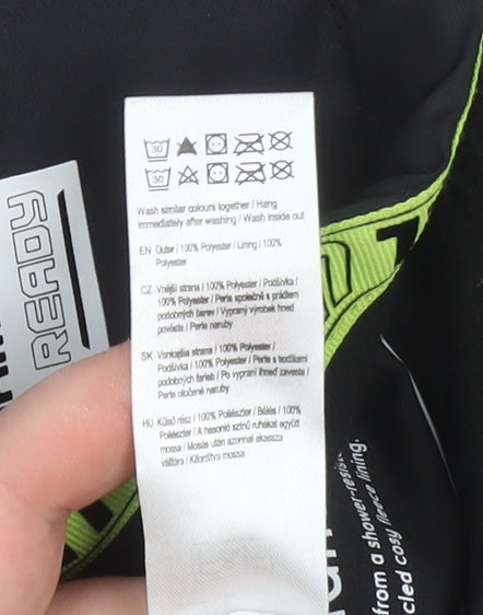 Keep your young one warm, dry and stylish with this versatile F&F Boys Hooded Water Resistant Rain Coat. Designed in a sleek black colour with bright green interior accents featuring a fun ‘LEVEL UP’ gaming-inspired trim, this jacket adds a modern twist to classic outerwear. Crafted entirely from 100% polyester, it provides lightweight flexibility while remaining durable enough to withstand regular use. The main body is softshell and fully lined for added comfort and warmth, making it ideal for cool Autumn, breezy Spring, and mild Winter days.The jacket features a full-length zip closure for easy wear, two secure zipped pockets for essentials, and an elastic waist with cuffs that help lock in warmth. Its hood provides extra protection against rain showers, while the water-resistant outer shell ensures your child stays dry during unpredictable weather. With a comfortable regular fit and long sleeves, it’s built for everyday adventures — from school runs and park playdates to outdoor walks.Accented with modern graphics such as ‘GAME READY’ and contrast-zip detailing, this jacket will appeal to young gamers and style-conscious kids alike. The machine-washable fabric makes it easy to care for and maintain, ensuring lasting quality and practicality for busy families.Ideal for casual use or light outdoor activities, this jacket combines performance with a trendy look, perfect for layering over school uniforms or weekend outfits. In excellent pre-owned condition with no visible flaws or wear, it offers both quality and value at an affordable price. Add this F&F Boys Black Hooded Rain Coat to your child’s wardrobe for reliable warmth, water resistance, and effortless everyday style.