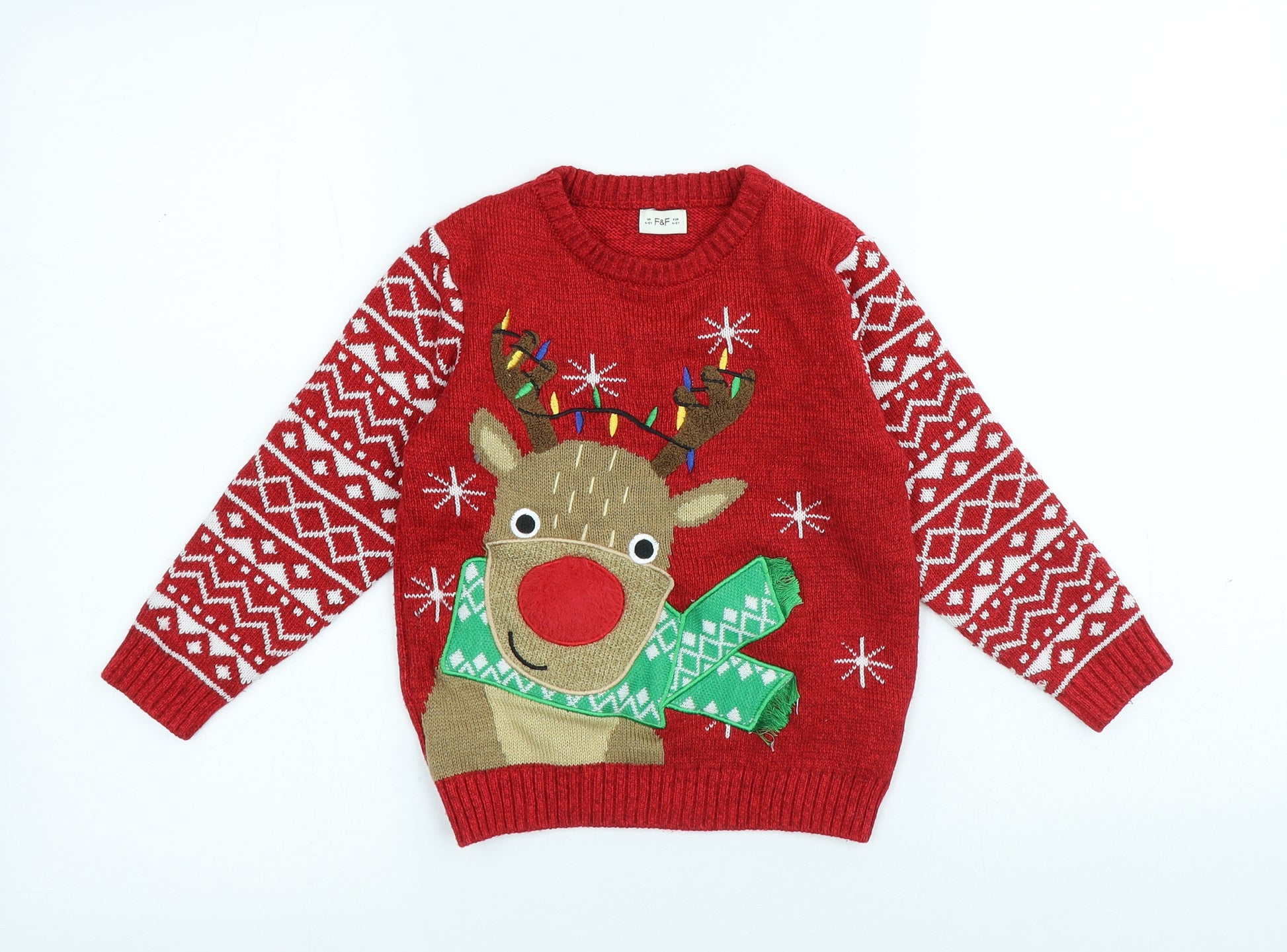 Boys Red Round Neck Polyester Pullover Jumper Size 4-5 Years - Reindeer Christmas