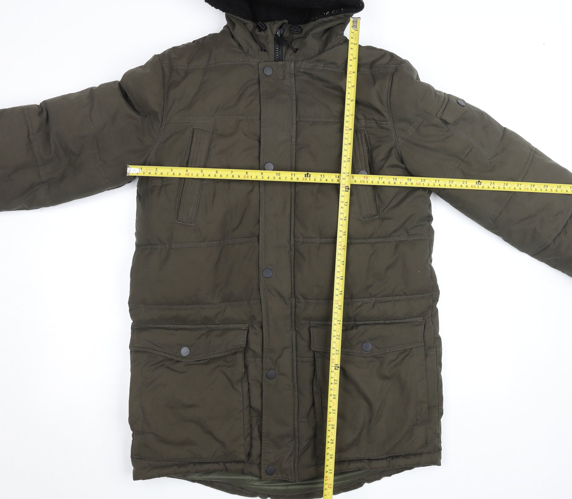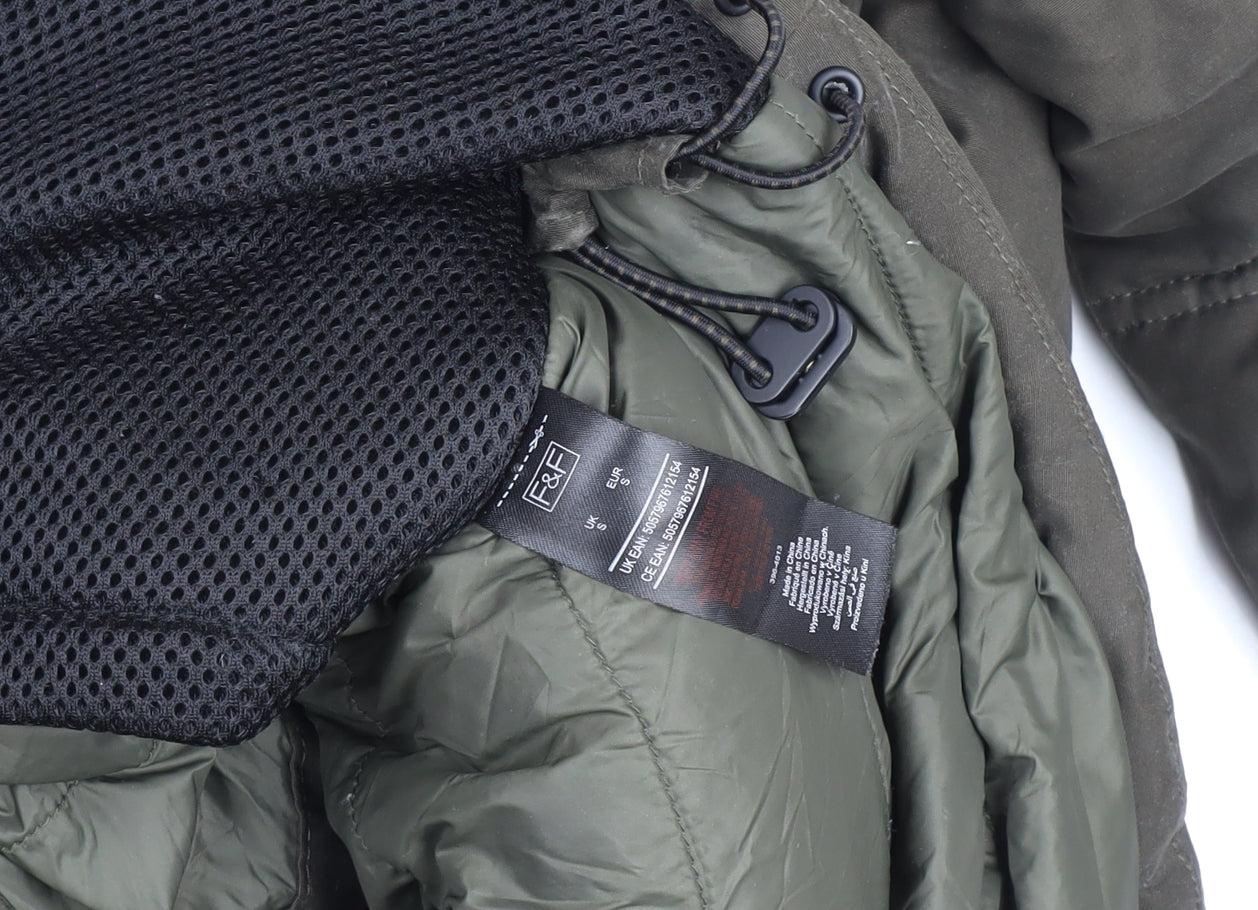 Stay warm and comfortable with this F&F men's green padded parka coat, designed for durability and everyday wear during the colder months. Crafted from a robust polyester and cotton outer shell, the coat provides reliable wind resistance and weather protection, making it ideal for outdoor use. The interior is fully lined with soft polyester to enhance warmth and comfort, complemented by insulating padding that helps retain body heat in chilly conditions. Designed in a classic parka silhouette, this piece features a secure full zip front with button fastening for added protection against the elements. A drawstring hood lined with cosy material offers extra warmth and adjustability, while multiple front pockets ensure practicality, perfect for keeping essentials at hand. The military-inspired detailing adds a subtle rugged charm to its look. The coat’s green colour lends versatile styling options that suit casual, travel, and workwear occasions. Its regular fit allows for comfortable layering without restriction, making it a great match with jumpers, jeans, and boots for an effortlessly smart outdoor look. The long-length design offers added coverage to keep you shielded from wind and cold, enhancing its functionality during winter or autumn weather. Made with easy-care machine-washable materials, maintenance is straightforward, ensuring long-lasting wear. The sturdy button accents, secure zip closure, and F&F’s dependable quality make this parka an excellent addition to any man’s outerwear collection. In very good used condition, it shows only light wear with no visible damage or flaws. Whether heading on a countryside walk, commuting, or running errands, this coat delivers both warmth and practicality with modern styling. Priced attractively for its quality and condition, it’s a great-value coat that combines everyday comfort and timeless appeal.