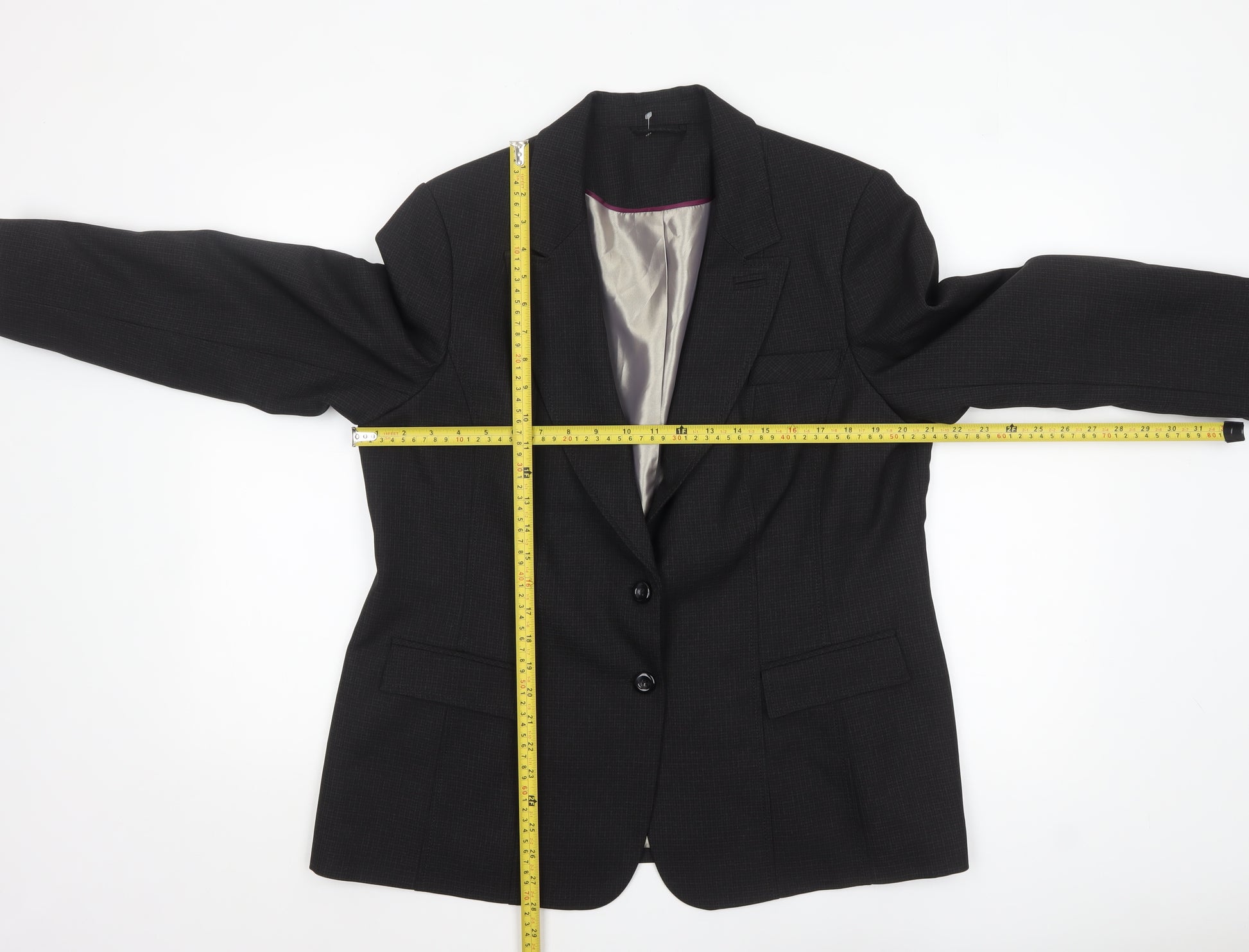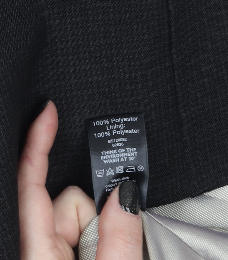 Elevate your professional wardrobe with this sophisticated women’s black suit jacket from F&F. Crafted in a timeless single-breasted design, this jacket offers a clean and elegant silhouette with a two-button front closure and classic notch lapels, making it an ideal staple for business, formal or office occasions. Designed in size 20, it provides a flattering and comfortable fit for the modern professional woman. The jacket is fully lined with soft 100% polyester for a smooth finish, ensuring comfort throughout your day. Made from durable woven polyester fabric, it maintains a structured form and resists creasing, keeping you looking polished from morning meetings to after-work events. Featuring long sleeves with buttoned cuffs, neat tailoring, and multiple front flap pockets, the piece balances practicality with refined detailing. Its classic black tone pairs effortlessly with matching trousers, skirts or blouses, offering versatile styling options for any formal or business setting. Perfect for cooler months such as autumn and winter, yet still wearable in transitional spring weather, this F&F blazer combines effortless sophistication with easy maintenance through machine washable care. Whether you dress it up for important presentations or style it more casually for everyday office wear, this jacket exudes professionalism, timeless appeal and confidence. Ideal for those seeking a wardrobe essential that transitions seamlessly between seasons and occasions, this is a piece that delivers both quality and practicality at an affordable price.