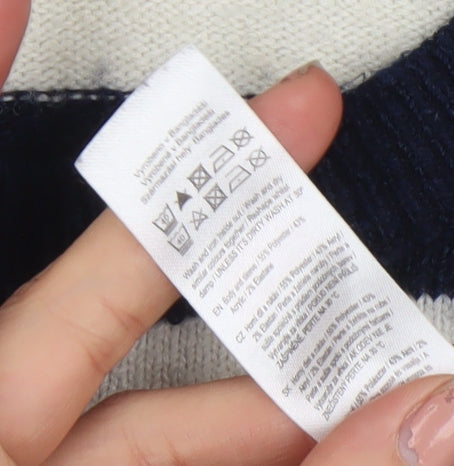 Brighten up your casual wardrobe with this chic F&F women’s multicoloured striped jumper, designed in a classic pullover style that blends comfort with eye-catching detail. Crafted from a soft knit fabric, this stylish piece features navy and cream horizontal stripes accentuated by a bold pink and lilac star motif on the front, making it perfect for adding a pop of personality to your everyday look. The jumper is made from a high-quality blend of nylon, polyester, acrylic, wool, and elastane, ensuring a lightweight yet warm feel with comfortable stretch for easy wear. The crew neckline and long sleeves create a timeless silhouette suitable for layering in cooler weather, while the ribbed cuffs and hem give a neat, flattering fit. Ideal for autumn and winter, this cosy knit brings both warmth and vibrancy to your seasonal outfits. Pair it effortlessly with jeans, leggings, or a casual skirt for a relaxed but put-together vibe. Whether you’re heading out for a weekend coffee, a stroll, or just lounging at home, this jumper offers versatility, comfort, and a stylish edge in one go. Its bold yet feminine appeal, combined with durable fabric and all-season adaptability, makes it a must-have addition to any wardrobe. In excellent pre-owned condition with only minimal signs of gentle wear, this piece maintains its quality aesthetic and comfort. A great value find for anyone looking for colourful knitwear that stands out while delivering reliable everyday style.