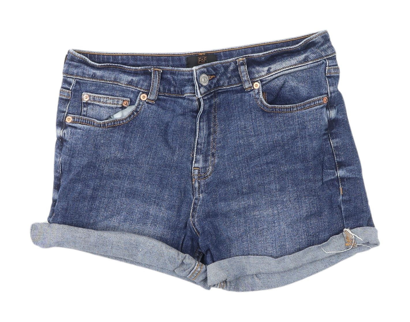 Upgrade your wardrobe with these classic F&F women's blue denim shorts. Crafted from a quality cotton blend with just a hint of elastane for added stretch, these shorts offer comfort and style. The cut-off style gives a casual vibe, perfect for summer outings or leisurely walks. Featuring a mid-rise and a flat front design, they ensure a flattering fit. The 5-pocket design adds functionality and keeps your essentials handy. Ideal for casual occasions, these shorts can be paired with a variety of tops. Enjoy the breathable and lightweight fabric during the warm seasons. These shorts, in excellent condition, are a versatile addition to any collection. Grab them today to make a fashion statement without compromising on comfort.