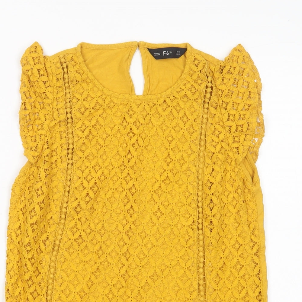 Womens Yellow Cotton Basic Blouse Size 6 Crew Neck - Lace Overlay
