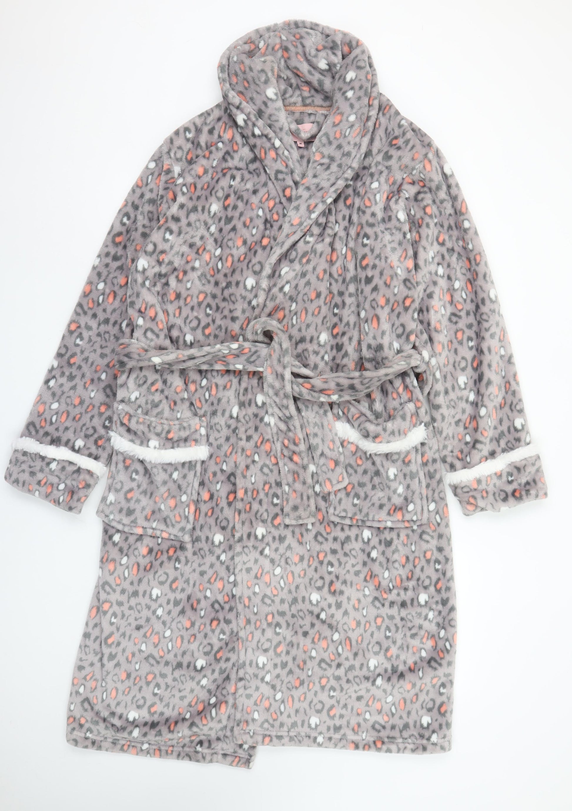 Stay warm and cosy in this Fairy Dust women’s fleece robe, designed with comfort and style in mind. Crafted in soft, plush 100% polyester fleece, this robe is perfect for lounging at home during the chillier months. The beautiful grey and coral animal print design adds a fun, modern twist to a classic nightwear essential. It features a belted waist for adjustable comfort and a flattering fit, along with long sleeves and roomy pockets that make it practical as well as stylish. The soft fabric and smooth texture make it ideal for wrapping up after a shower or relaxing before bed. Cut in a kimono-inspired silhouette, this robe complements your natural shape while allowing plenty of freedom to move. The tie closure ensures a secure fit, while the lightweight fleece fabric offers warmth without being too bulky. The design is finished with white trim on the cuffs, giving it a neat and polished appearance.In excellent used condition, this Fairy Dust robe shows minimal signs of wear, with its softness and vibrant pattern well preserved. It’s easy to care for, being machine washable, and retains its lovely feel wash after wash. Perfect for the winter season, its plush texture makes it an inviting addition to your nightwear collection. Whether you’re treating yourself or gifting it to someone who loves cosy comforts, this robe blends warmth, quality, and style effortlessly.Ideal for relaxing moments at home, weekend mornings, or unwinding after a long day, this robe provides a touch of luxury at an affordable price. The delightful animal print adds a playful edge, making it a stylish yet practical choice for any woman who loves fashion-forward comfort.