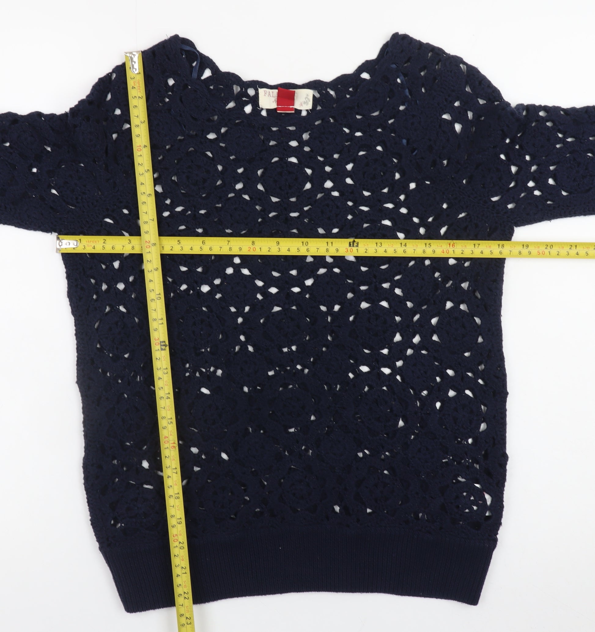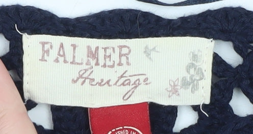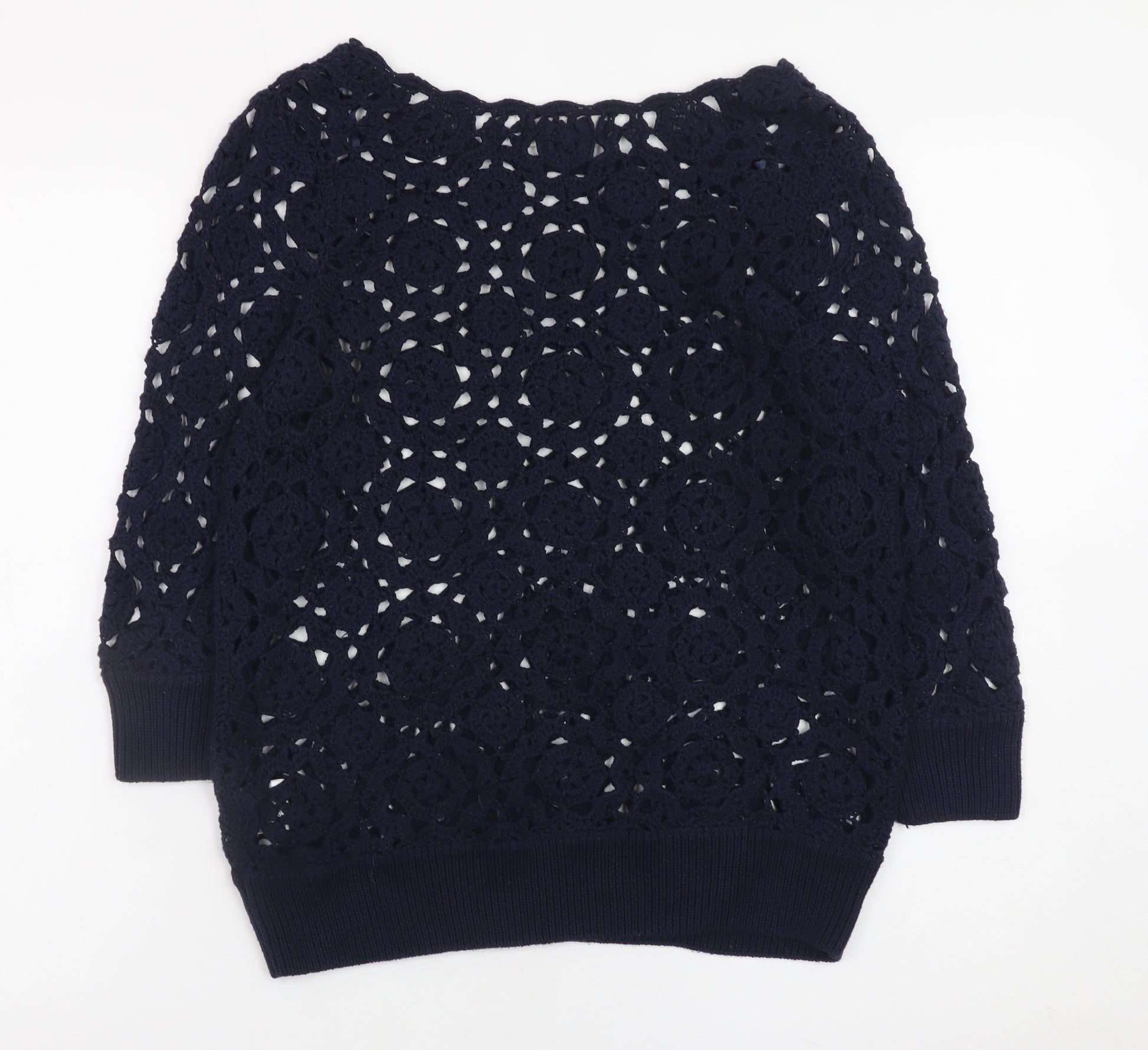 Add effortless charm to your wardrobe with this stunning Falmer Heritage women’s crochet jumper in a versatile navy blue hue. Designed with a beautiful open-knit crochet pattern, it brings a touch of bohemian sophistication that’s perfect for casual outings, weekend brunches, or layering over a camisole during warmer months. This pullover combines breathable comfort with intricate texture, crafted from a balanced blend of 50% cotton and 50% acrylic for softness, durability, and easy care. The lightweight design makes it ideal for spring and summer wear, offering a relaxed fit that flatters a range of silhouettes. Styled with a gentle boat neckline and comfortable three-quarter length sleeves, it achieves a chic yet laid-back aesthetic suitable for everyday wear. The classic blue colour pairs easily with jeans, skirts, or tailored trousers for a timeless look that transitions effortlessly from day to evening. Whether you’re dressing up for a casual dinner or enjoying a weekend stroll, this Falmer Heritage jumper delivers both comfort and understated elegance. With a hand-crafted crochet appearance and ribbed hem detailing for added structure, this piece embodies a blend of classic and contemporary style. The quality craftsmanship and breathable fabric ensure you’ll reach for it throughout multiple seasons. Easy to maintain and machine washable, it’s a practical yet stylish addition to any wardrobe. In excellent pre-owned condition with no visible flaws, this jumper represents a superb choice for those who value thoughtful detailing and versatile design. Make it yours and enjoy chic comfort all season long.