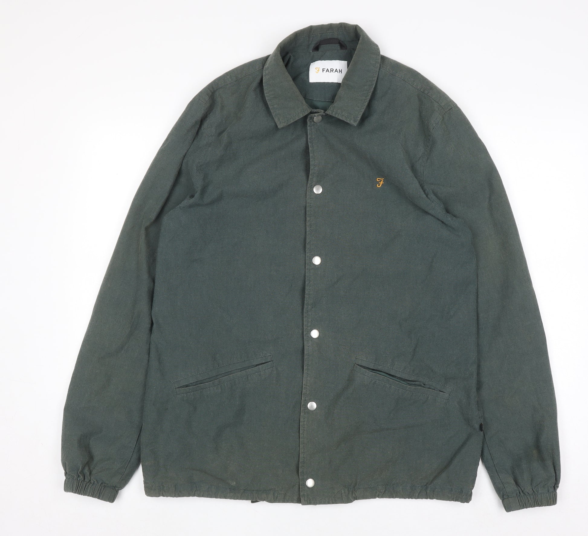 Step up your layering game with this sleek Farah men’s green coach jacket in size M. Designed with clean lines and a minimalist aesthetic, this jacket delivers both comfort and understated style. The outer shell is crafted entirely from cotton, giving it a breathable, soft and durable finish suitable for everyday wear across the seasons. Its rich khaki-green tone makes it versatile and easy to match with any outfit, from casual jeans to smarter chinos.The jacket features a smart point collar, full button closure and two front pockets that combine practical appeal with modern simplicity. The elasticated cuffs and hemline ensure a comfortable fit while helping to maintain shape, making this piece ideal for transitional weather such as spring or autumn. The discrete gold-embroidered Farah logo on the chest adds a touch of refinement and brand identity, completing the classic silhouette.This mid-length cotton jacket is machine washable, allowing for easy care. Its regular fit offers room for layering without being bulky, delivering a timeless, wearable design suitable for both casual days and laid-back evenings. In very good pre-owned condition, it shows only light wear with no significant marks or damage, reflecting careful previous ownership.Whether you’re heading out for a relaxed weekend stroll, meeting friends, or on your commute, this Farah cotton jacket provides dependable style and comfort. Combining practicality with timeless design, it’s the perfect addition to any contemporary wardrobe seeking quality craftsmanship and classic British flair.