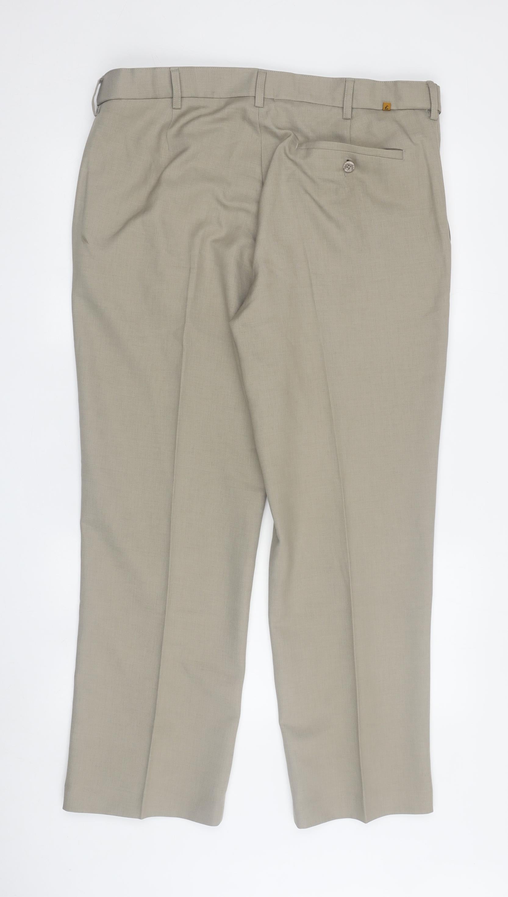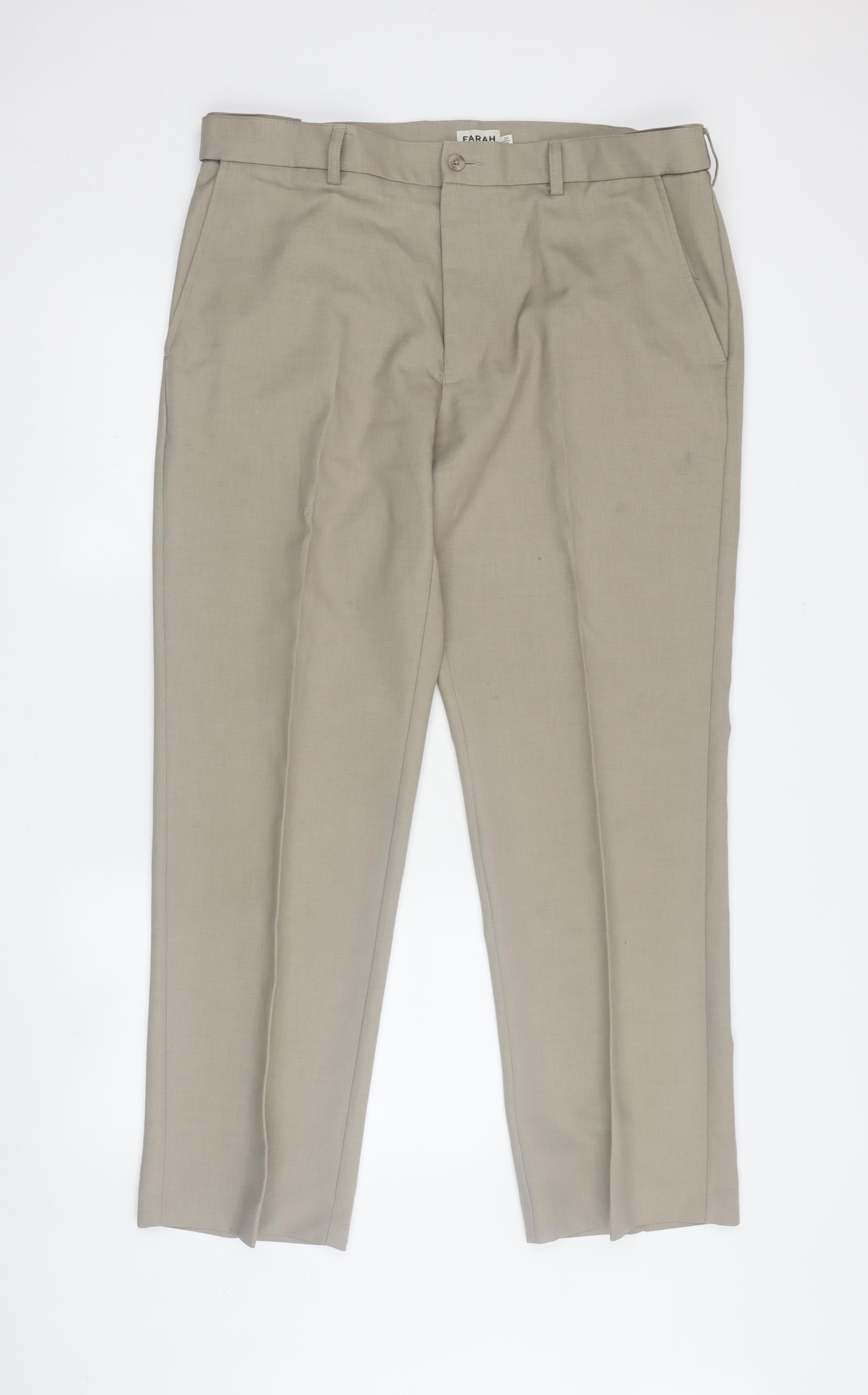 Enhance your wardrobe with these classic beige trousers from Farah, tailored for the modern man. Designed with a regular fit and a straight leg style, these trousers offer comfort and sophistication for everyday wear. The flat front and button-zip closure ensure a sleek look, making them ideal for various occasions. Crafted from 100% polyester, they are lightweight and machine washable, promising convenience and longevity. The size 36 waist and 29-inch inside leg provide a perfect fit for those seeking classic proportions. Featuring slash pockets for practicality, these trousers are a versatile choice for casual or semi-formal settings. With no pattern and a neutral beige colour, they are effortlessly stylish, ready to pair with a variety of shirts or jackets. Though pre-owned in excellent condition, some light wear is visible, reflecting their vintage appeal. Whether you're heading to the office or enjoying a day out, these trousers maintain a classic charm that never goes out of style.