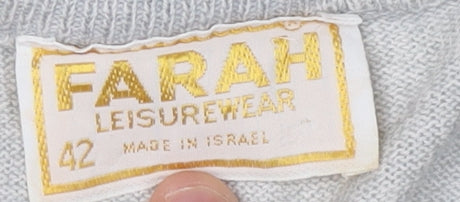 Step back into a retro era with this stylish grey Farah pullover jumper, perfect for the autumn months. Crafted in a classic crew neck style, this piece embodies vintage charm and provides a comfortable fit with its regular sizing. Its geometric pattern is subtly eye-catching, while the tight-knit fabric ensures warmth and durability. Ideal for any casual outing, this jumper is versatile enough to layer for additional warmth or stand alone as a statement piece. While it shows minimal signs of discolouration, the overall piece is in very good condition, offering timeless style and comfort. Made from high-quality wool, it boasts a classic fit suitable for men seeking both style and practicality. Elevate your wardrobe with this quintessential vintage item from Farah.