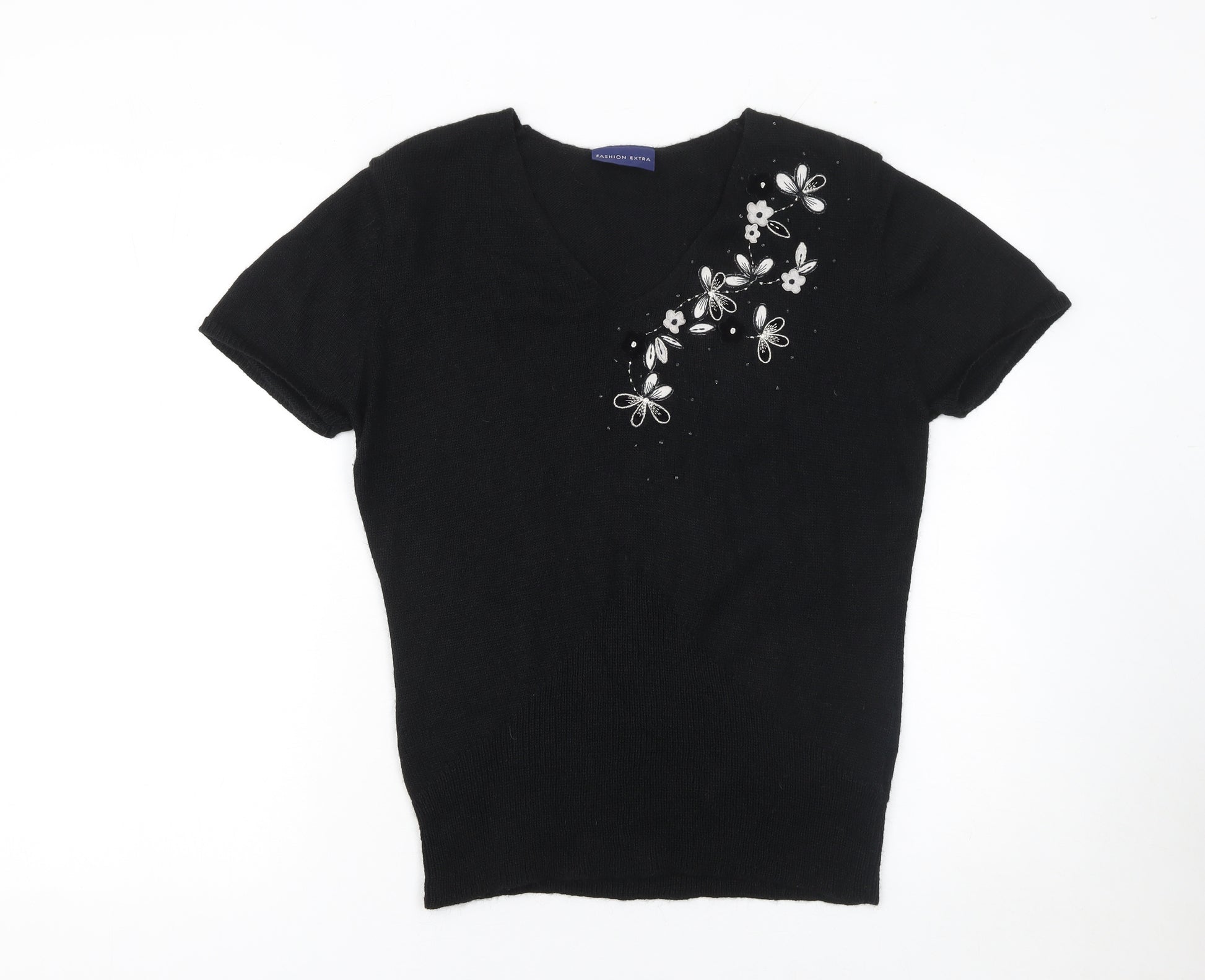 This elegant black jumper from Fashion Extra offers a timeless design that seamlessly blends classic style with a subtle touch of embellishment. Crafted for women, the lightweight knit feels soft against the skin and ensures all-day comfort. The pullover style features a flattering V-neckline that adds definition and sophistication, making it easy to wear with both casual and smart outfits. The short sleeves and regular fit make this piece ideal for layering under blazers or pairing with skirts, trousers, or jeans for versatile seasonal wear.The jumper stands out with delicate embroidered and beaded floral accents adorning one shoulder, giving it a feminine yet understated charm. Constructed from a soft acrylic-polyamide blend, it provides a smooth texture and gentle stretch for comfort while maintaining its shape wash after wash. The fine tight-knit finish ensures a polished look that works just as well for relaxed occasions as for more dressed-up gatherings.Practical and stylish, this black pullover jumper is machine washable for easy care. It’s perfect for transitional weather in spring or autumn but can also be layered for cosy warmth through winter. Suitable for women who appreciate both comfort and fashion-forward details, it pairs beautifully with tailored trousers or denim alike.This Fashion Extra jumper is in excellent pre-owned condition with no visible flaws or signs of heavy wear. Offering durability and effortless elegance, it makes a wonderful addition to any wardrobe. A versatile essential that delivers timeless appeal and everyday wearability at a fantastic value — making this a must-have piece for seasons to come.
