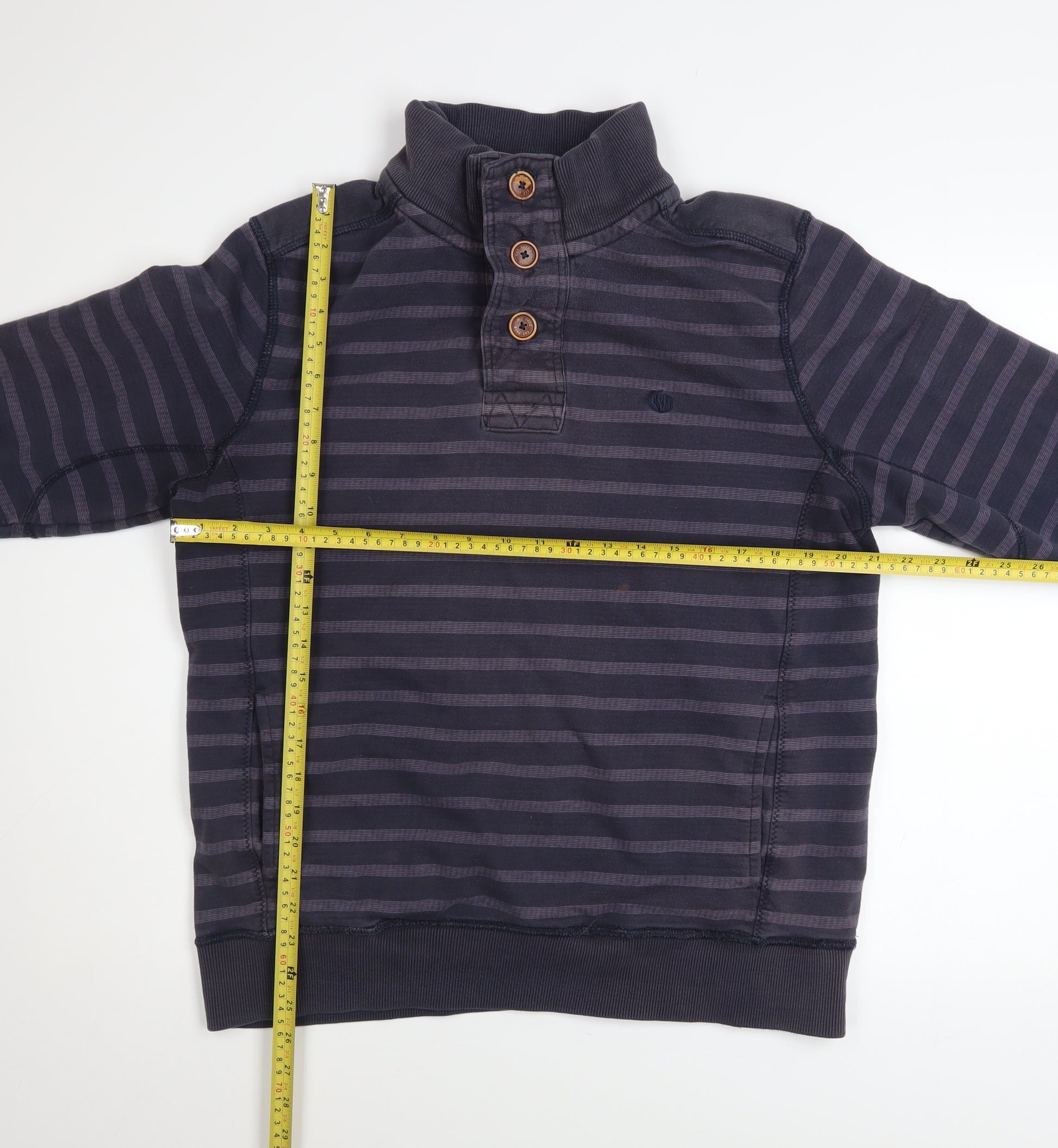 This Fat Face men's blue striped Henley sweatshirt is a timeless and versatile piece ideal for all-season wear. Crafted from high-quality 100% cotton, it offers a soft and breathable feel perfect for layering or wearing on its own. The washed navy tone with lighter horizontal stripes adds a classic yet casual style, ideal for relaxed weekends or outdoor activities. The design features a high Henley neckline with three button fastenings, providing a comfortable and stylish look. Ribbed cuffs and waistband give it a structured fit, while subtle Fat Face branding adds a refined finishing touch without being overpowering. Its long sleeves make it equally suited for cooler autumn evenings or layering during winter months. The durable jersey fabric ensures long-lasting wear and comfort. Although gently used, this sweatshirt remains in good condition, showing only light signs of wear with a small faint stain on the front and minor cuff wear, which do not detract from its overall aesthetic. This Fat Face sweatshirt reflects the casual outdoor-inspired brand ethos, combining functionality and relaxed British style. Perfect with jeans or chinos, it’s an everyday favourite for those who appreciate comfort and a hint of rustic charm. Machine washable for ease of care, it’s designed for men seeking effortless comfort and understated style. Whether for a walk along the coast or a casual day out, this Henley sweatshirt makes an excellent addition to any wardrobe, offering both quality and timeless appeal at an affordable price.
