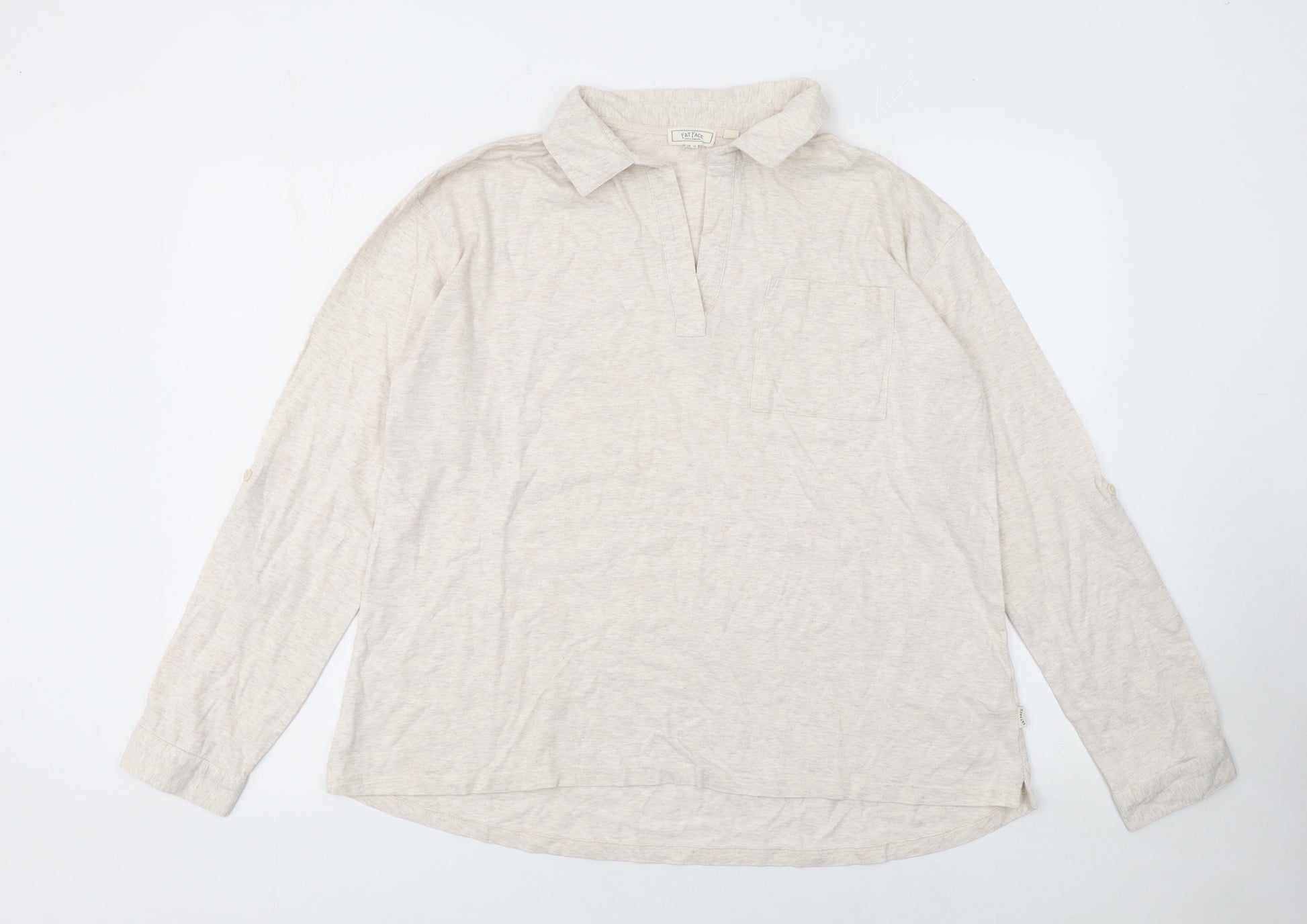 This Fat Face Women’s Beige Long Sleeve Cotton Button-Up Shirt in UK size 14 offers effortless comfort and laid-back style. Crafted from 100% cotton in a soft jersey fabric, it is lightweight, breathable, and ideal for layering through spring and autumn seasons. The natural beige tone pairs perfectly with everything from jeans to skirts, making it a versatile everyday piece. Designed in a relaxed silhouette with a collared neckline and button accent closure at the cuffs, this shirt provides a polished yet casual look suitable for daily wear or casual office settings. The long sleeves add coverage and warmth while the airy cotton keeps you cool and comfortable throughout the day. The front chest pocket adds a subtle touch of detail and functional appeal. The material’s soft hand feel and breathable quality make it perfectly suited for long-lasting comfort. Featuring a lightweight design, this shirt layers easily under jumpers or jackets in cooler weather, or can be worn alone for a classic, easygoing style in milder temperatures. The regular fit flatters a wide range of body shapes, keeping the look casual yet refined. This Women’s Fat Face shirt shows minimal signs of prior wear and has been kept in very good condition, maintaining its soft fabric and fresh colour. A wardrobe essential for women who value quality, timeless pieces, this shirt embodies Fat Face’s signature casual British style and durability. Ideal for relaxed outings, travel, or workwear, it’s an easy addition to your clothing collection that combines simplicity with understated charm. Pair it with slim jeans and trainers for a clean casual look or with tailored trousers for a more put-together outfit. A must-have for those who appreciate comfort and quality. Get this excellent-condition Fat Face top at an affordable used price today!