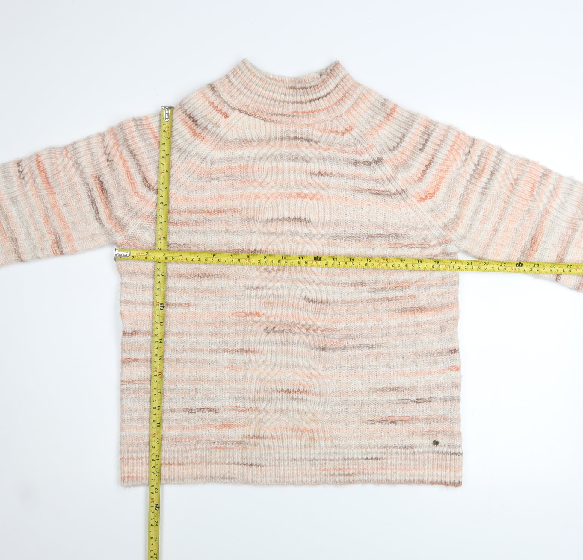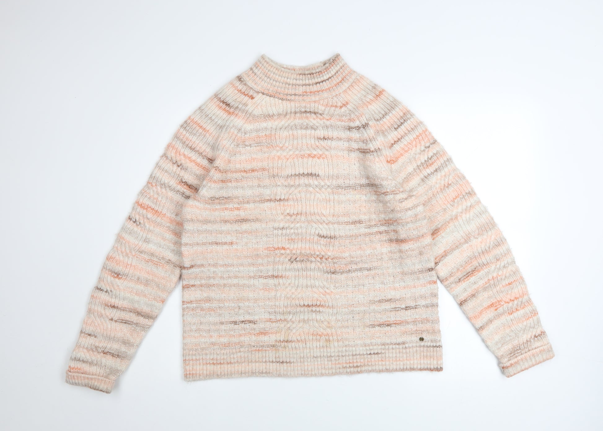 Stay effortlessly cosy in this beautiful Fat Face women's chunky knit jumper, ideal for adding a touch of comfort and style to your cool-weather wardrobe. Crafted in a soft and tactile blend of polyester, acrylic, nylon, and wool, this pullover promises both warmth and durability with a gentle, cozy texture against the skin. The relaxed fit and raglan sleeve construction lend it a naturally easy silhouette that drapes comfortably, allowing freedom of movement and everyday wearability. Presented in a subtle beige tone with a marl effect featuring muted peach and taupe shades, this striped jumper offers a versatile and on-trend colour palette. The high neck design ensures added warmth and chic simplicity, while the ribbed cuffs and hemline reinforce a snug, flattering shape. Perfect for layering under coats during chilly autumn walks or wearing solo on mild winter days, this Fat Face knit embodies casual sophistication. The long sleeves make it especially fitting for cooler months, and the cosy knit texture gives it the right balance of softness and structure. Its the ideal choice for laid-back days at home, lounging with a book, or paired with jeans and boots for a relaxed weekend outing. Designed for all seasons but best suited to autumn and winter, it’s versatile enough for casual outings, work-from-home comfort, or countryside escapes. Responsibly made and built to last, this piece remains in excellent pre-loved condition with no visible defects or wear marks—ready for a new owner to enjoy for years ahead. Combining practical warmth, comfort, and style, this Fat Face jumper is a timeless wardrobe essential that blends functionality with effortless everyday fashion.