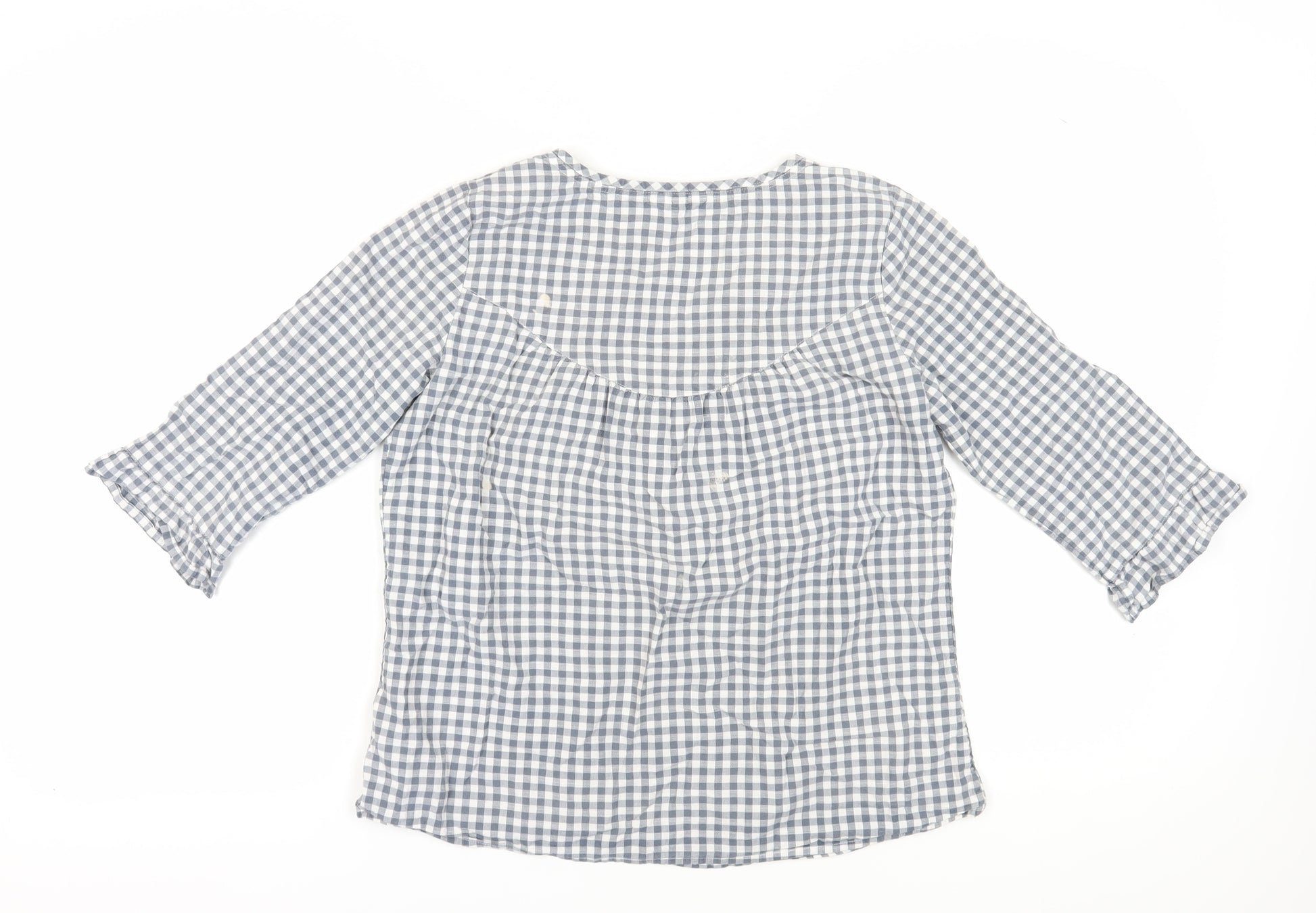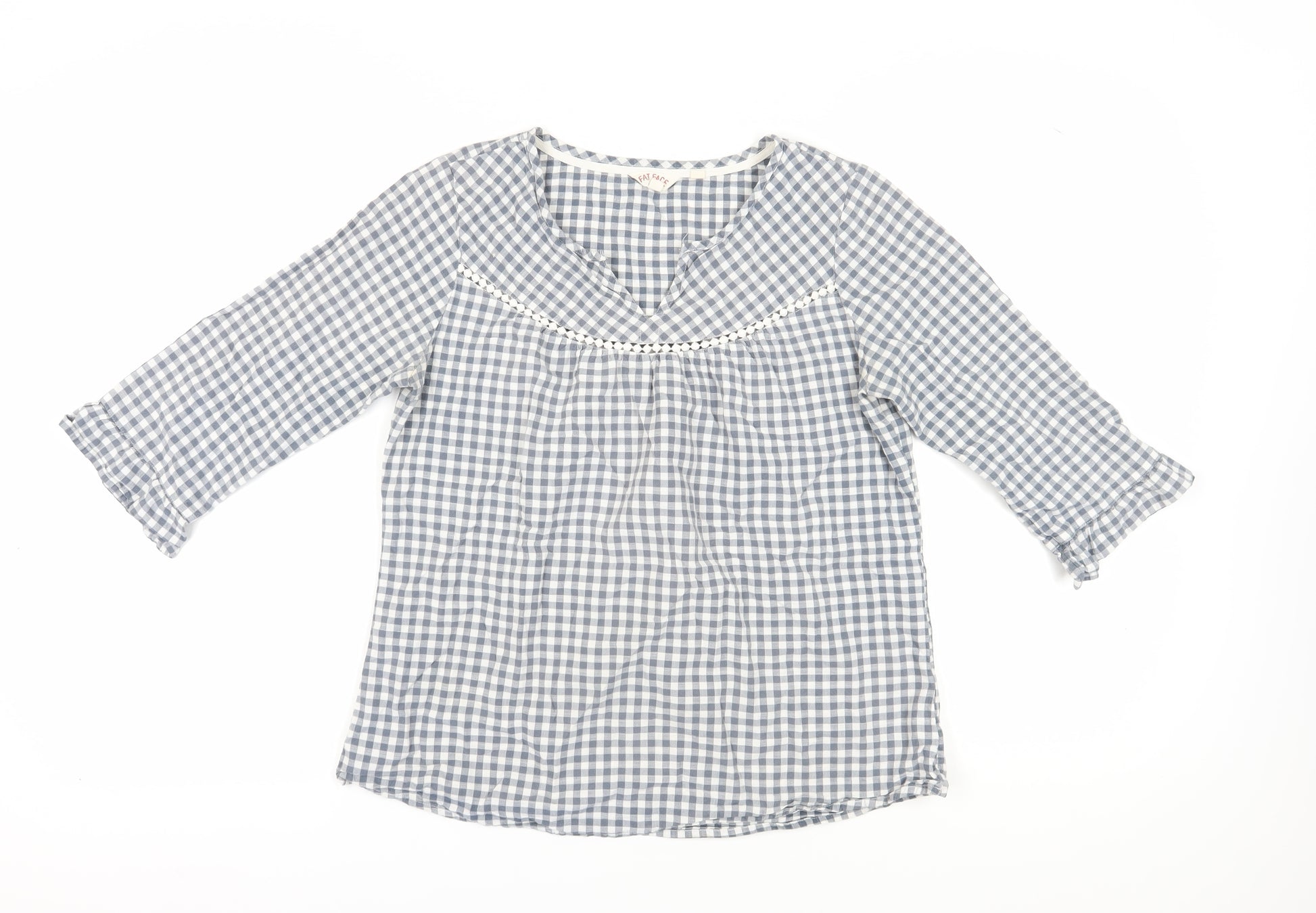 Discover casual style with this Fat Face women's blouse in a charming blue check pattern. Made from lightweight cotton, this regular fit top features 3/4 length classic sleeves and a flattering V-neckline, perfect for spring and summer wear. Embroidered accents add a touch of elegance while the woven fabric ensures comfort and breathability. A versatile pullover design, suitable for relaxed occasions. Despite a minor stain, it remains in very good condition, ready to elevate your everyday wardrobe. Easy to care for with machine washable fabric.