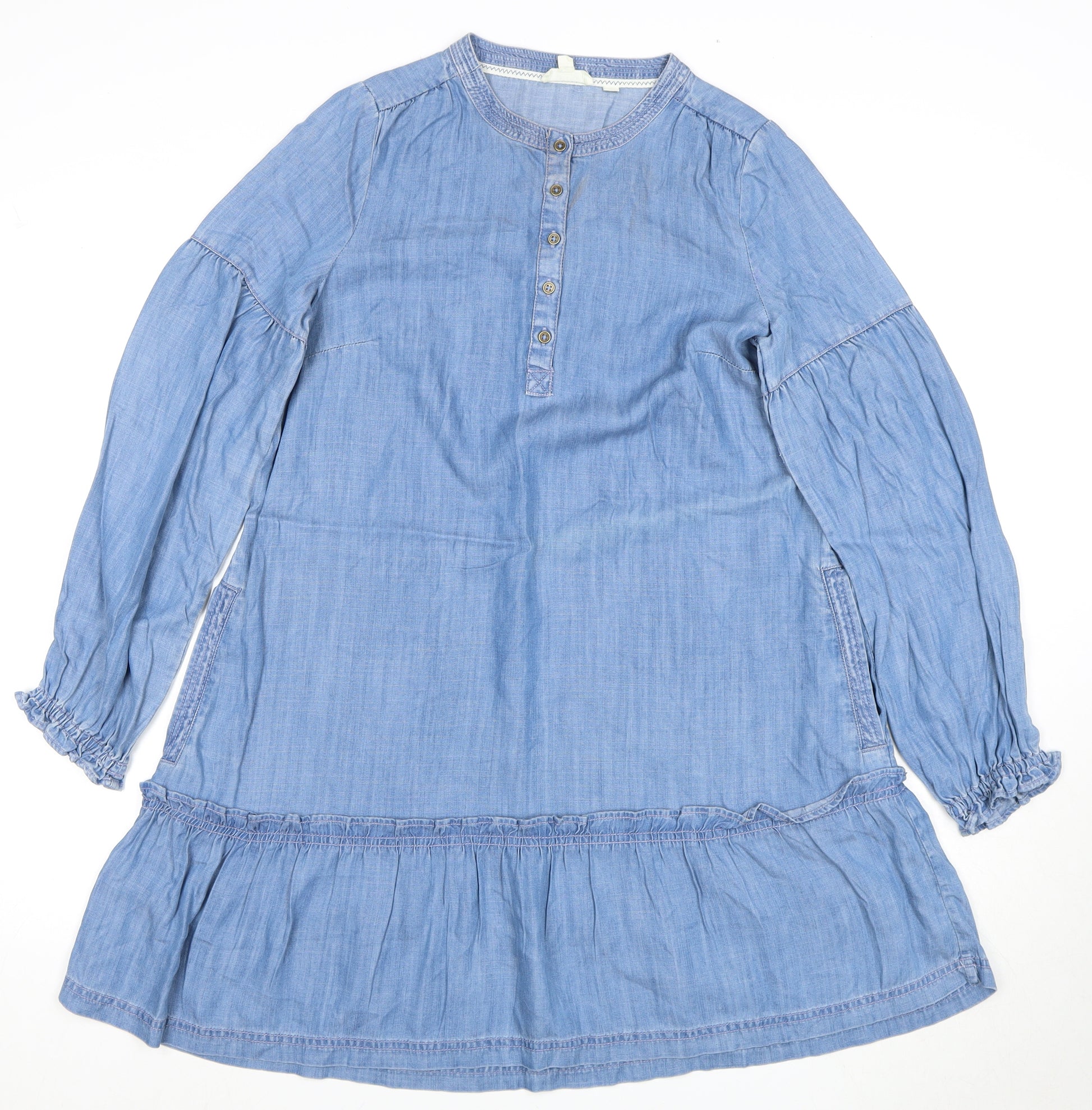 Enhance your casual wardrobe with this delightful Fat Face Women's Chambray Dress in a serene blue hue. Crafted for ultimate comfort and style, this knee-length shift dress is perfect for your day-to-day adventures. Featuring a classic round neck and long balloon sleeves, it offers a relaxed yet fashionable look suitable for any casual setting.The dress is made from a soft blend of cotton and lyocell, providing a lightweight and breathable fabric perfect for warmer seasons like spring and summer, or layered looks in autumn. The button closure and chic no-pattern design add understated elegance, making it versatile for any wardrobe.Ideal for casual occasions, this dress's comfortable fit and durable chambray fabric ensure it remains a staple piece for seasons to come. The stylish button accents provide a subtle detail that enriches its simple elegance. Machine washable for your convenience, upkeep is effortless and ensures continued wear.In excellent condition with no visible flaws, this dress offers great value and style for the price. Make it a go-to for effortless fashion and comfort in your clothing collection.
