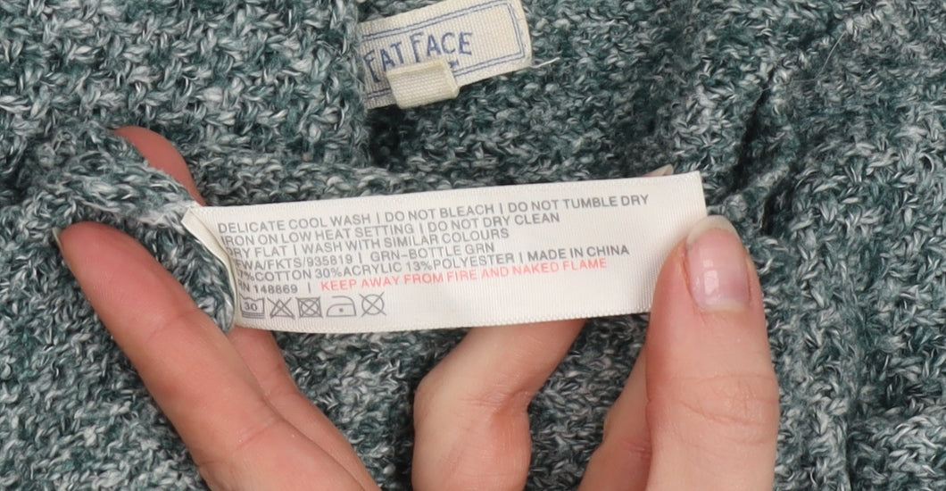 Add cosy charm to your wardrobe with this Fat Face women’s jumper, crafted in a rich bottle green tone that perfectly complements the cooler months. Designed in a soft, comfortable cotton blend, the knit promises warmth and breathability for effortless all-day wear. The pullover style features a classic crew neckline, long raglan sleeves for ease of movement, and a flattering curved hemline. Its tactile tight-knit texture brings subtle character while keeping your look relaxed yet put-together.This Fat Face jumper is made from a composition of 57% cotton, 30% acrylic, and 13% polyester, offering a soft hand-feel with lasting durability. Lightweight and breathable, it’s ideal for layering over shirts, pairing with jeans, or styling under a coat when the temperature drops. The rich marled bottle green shade adds versatility, making it suitable for everything from casual weekend walks to cosy evenings in.Beautifully cut for a regular fit, this knitwear piece sits comfortably on the body and works equally well for autumn, winter, and spring wardrobes. The long sleeves are finished with rib-knit cuffs to maintain shape through multiple washes. The quality, craftsmanship, and timeless appeal associated with Fat Face ensure it remains a reliable favourite year after year.In excellent used condition with no visible flaws or damage, this pre-loved jumper represents exceptional value. Combining comfort, style, and durability, it captures the casual yet elevated aesthetic that defines Fat Face knitwear.Perfect for the woman who loves effortless everyday style, this jumper is a seasonal staple offering cosy warmth, classic design, and easy wearability. A truly versatile piece for your off-duty wardrobe.
