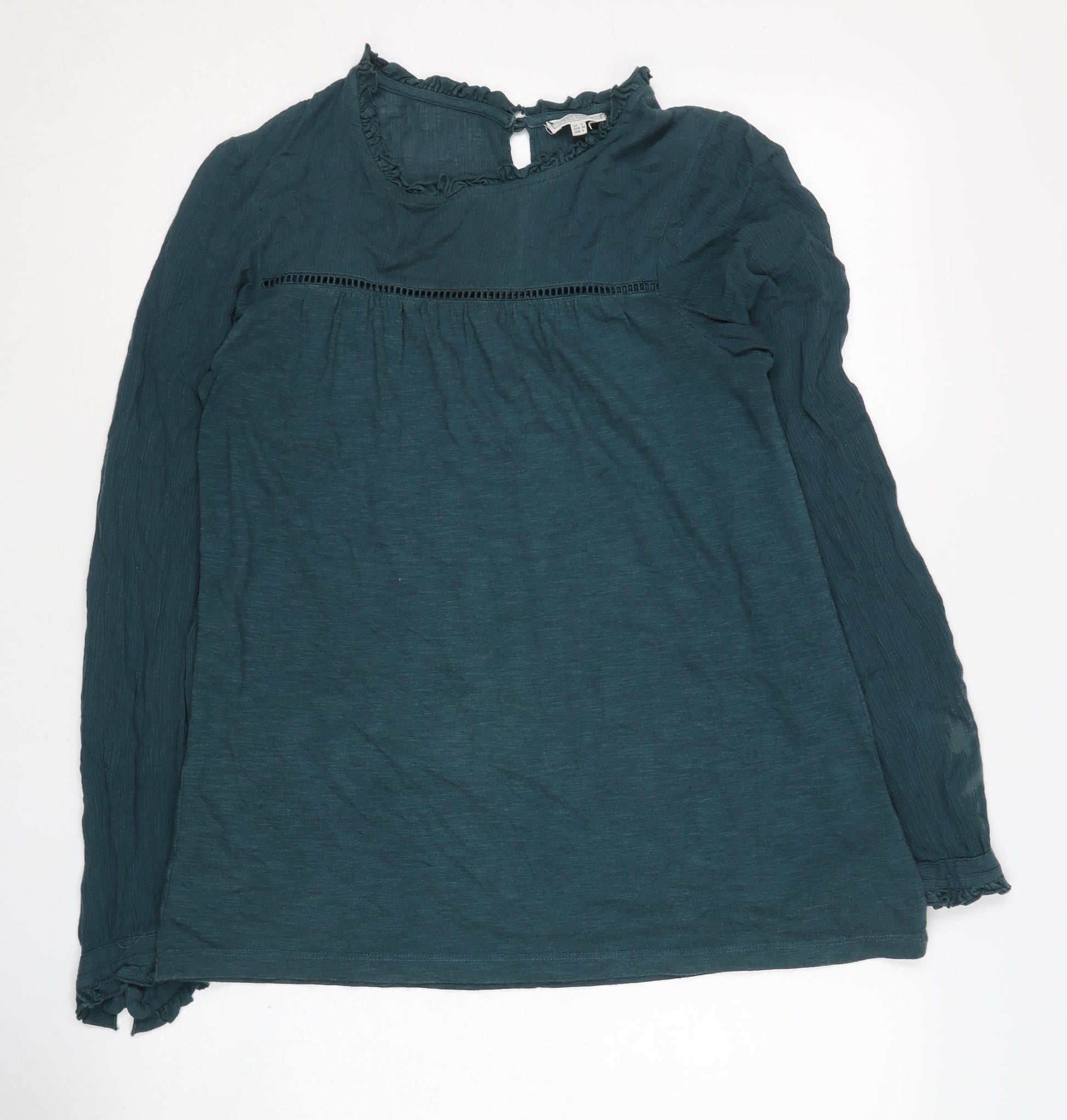 Discover style and comfort with this Fat Face women's top in a rich green hue. Perfectly tailored for the modern woman, it comes in size 6 and features a long sleeve design, making it ideal for cooler days. Made from a quality blend of cotton and modal, this top offers both softness and durability. The round neckline adds a touch of classic elegance while keeping the look versatile. An excellent addition to any wardrobe, its solid pattern lends itself well to both casual and slightly more dressed-up occasions. Whether you're heading to a casual day out or a laid-back evening gathering, this top serves as a great choice. Although it shows slight wear on the sleeves, it is in good condition, reflecting its previous love and use. Machine washable for easy care, this piece is simple to maintain and long-lasting. Priced at an affordable £12.50, it's a must-have staple without breaking the bank. Enhance your collection today with this essential Fat Face top!