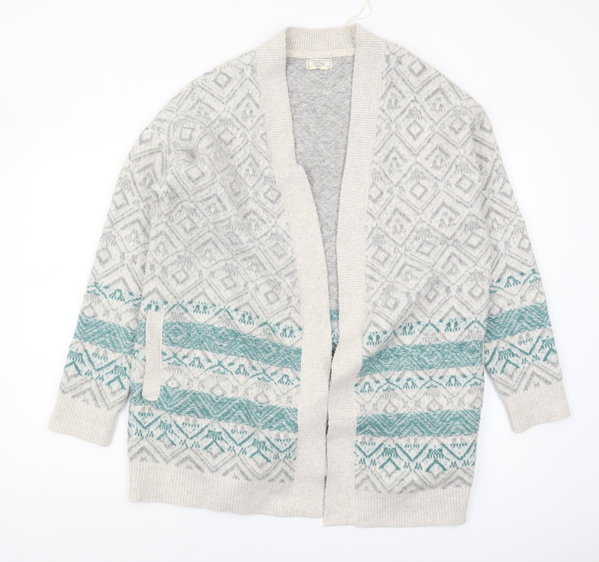 Discover comfort and style with this Fat Face women's grey cardigan, perfect for autumn and winter seasons. Crafted with a Fair Isle pattern, this cardigan is a staple for any casual occasion. Made from a quality knit fabric blend of 53% polyester, 26% acrylic, 9% nylon, 7% wool, and 5% elastane, it offers warmth and durability. The relaxed fit and open features make it easy to layer over your favourite tops. Designed for machine washability, it provides easy care. Available in size UK 10, this piece is ideal for adding a touch of elegance to your wardrobe. Excellent condition with no visible defects, offered at an attractive price.