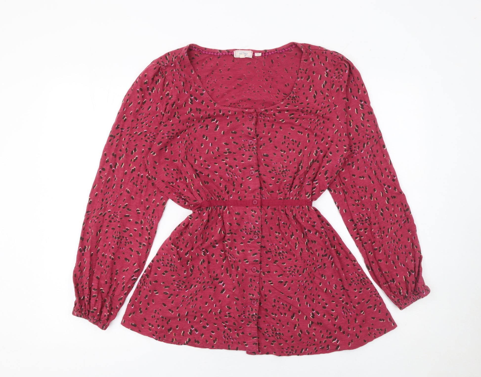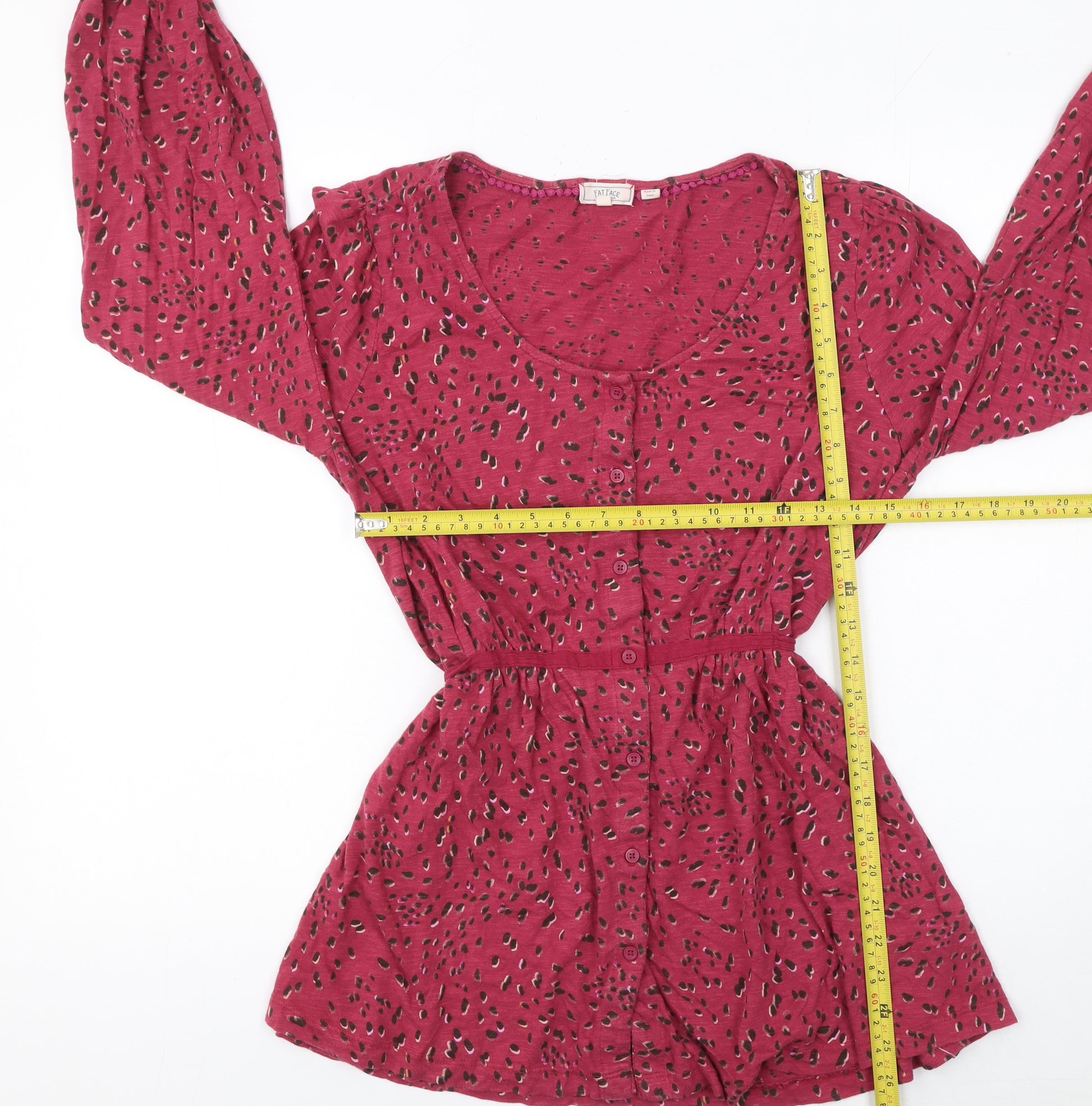 Elevate your casual wardrobe with this charming red Fat Face tunic blouse, designed with effortless style and comfort in mind. Crafted from soft and breathable 100% cotton, the top offers a naturally comfortable feel that’s ideal for all-day wear. The jersey fabric ensures ease of movement, while the breathable material keeps you cool in warmer weather and cozy when layered for the cooler months. Designed in a relaxed regular fit, it features a flattering scoop neckline and full button front closure, teamed with a waist tie to enhance your silhouette. The long sleeves are finished with gathered cuffs, giving a touch of feminine detail that complements its easy-going style. The eye-catching red base is adorned with a subtle animal print design, lending modern flair while maintaining a timeless appeal. Perfect for both casual days and effortless office looks, this tunic blouse transitions beautifully from workwear to weekend wear. Pair it with jeans and boots for a laid-back ensemble, or tuck it into a skirt for an elevated everyday outfit. Being in excellent pre-owned condition with no visible signs of wear, this piece offers premium quality and lasting comfort typical of Fat Face craftsmanship. Machine washable and designed for versatile styling, this blouse makes a reliable and stylish addition to any woman’s collection. Whether worn for lively get-togethers, everyday errands or relaxed evenings, it provides a flattering, fuss-free fit that never goes out of style. This Fat Face red cotton tunic blouse blends casual sophistication with easy wearability, making it a must-have option for the modern, confident woman. Embrace effortless charm and comfort with a wardrobe staple designed to stand the test of time.